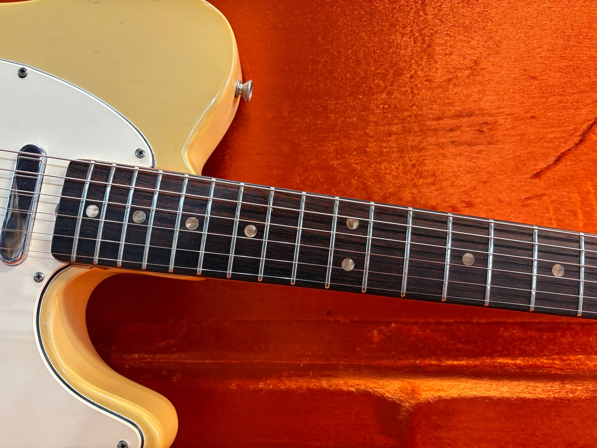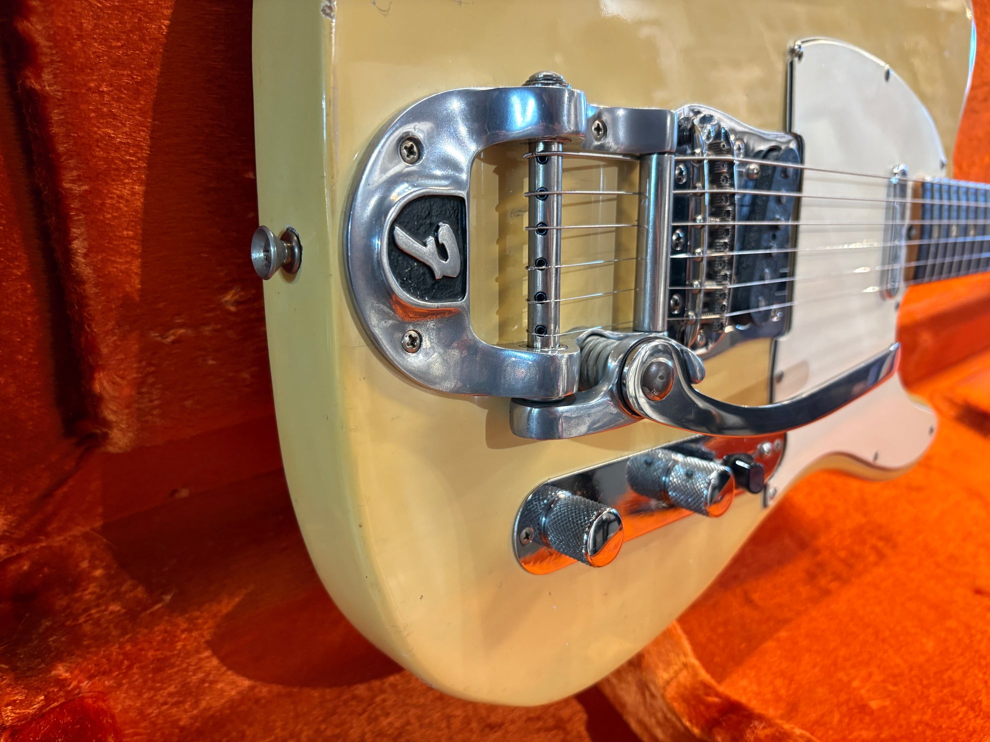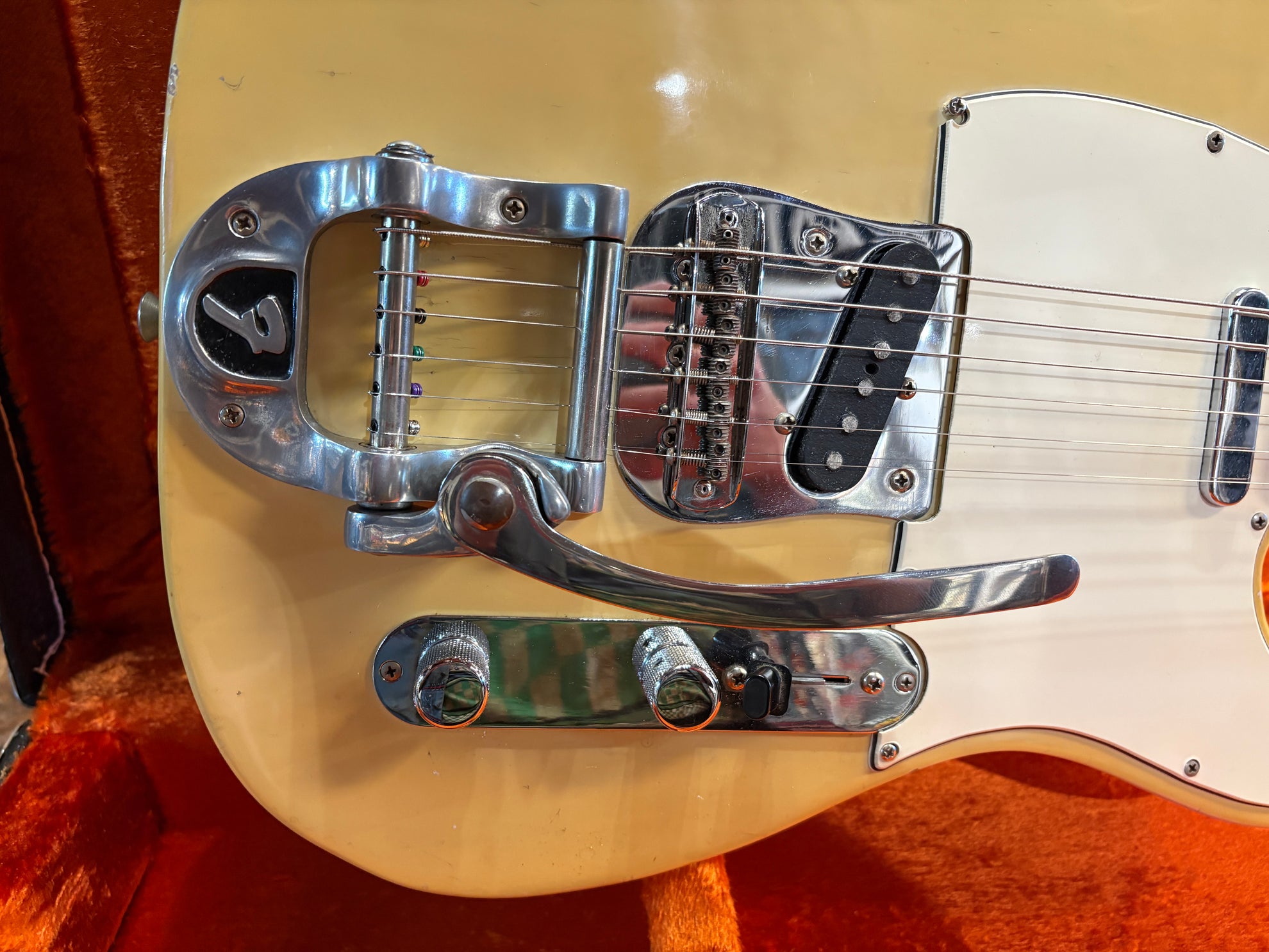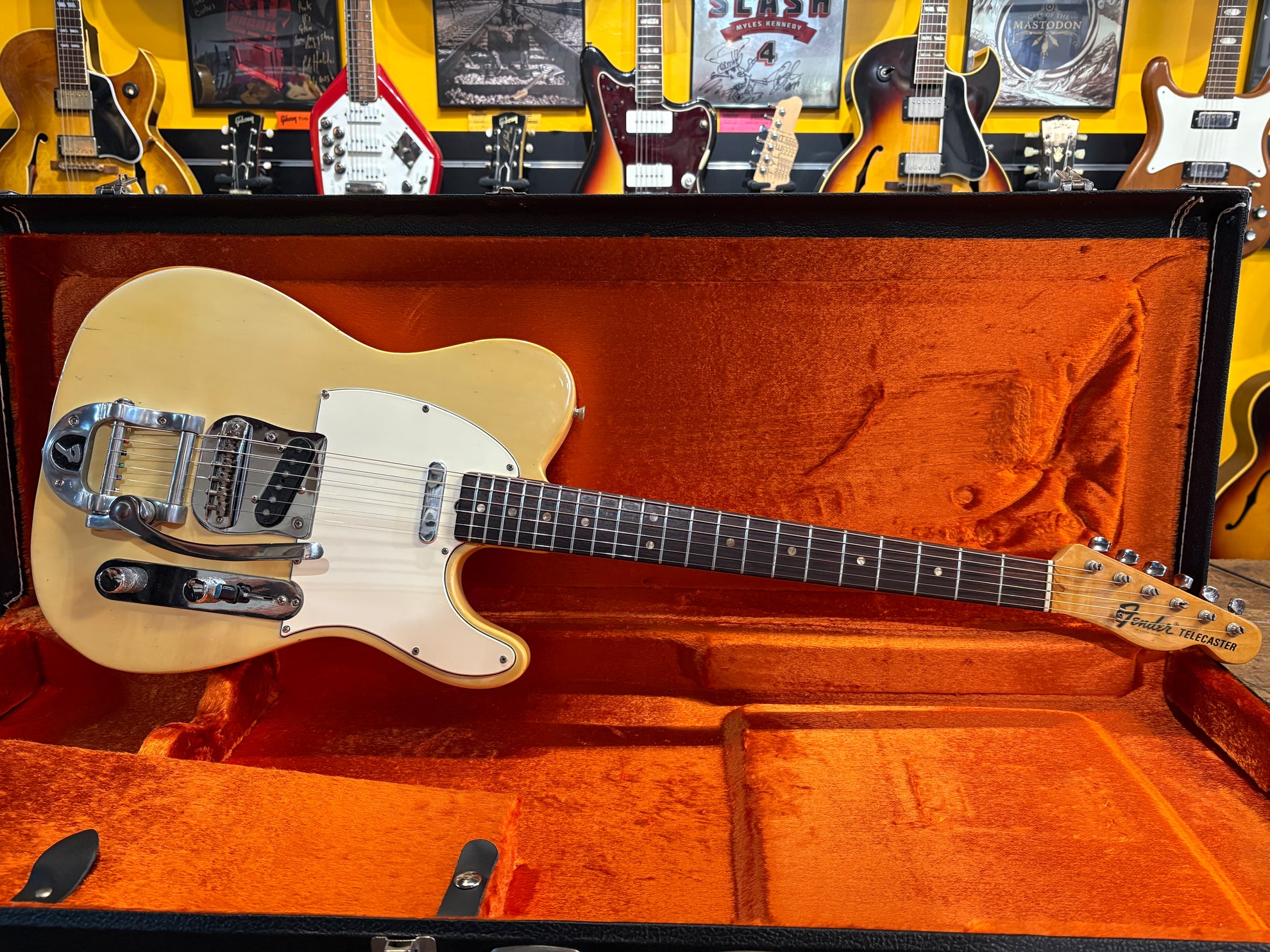 1969 Fender Telecaster Bigsby Blonde, in excellent vintage condition. Factory original Bigsby. All original aside from both of the original pickups have been rewound, the bridge pickup was rewound by Andreas Klopmann. Super lightweight, even with the Bigsby! A fantastic player. Includes NOHSC.