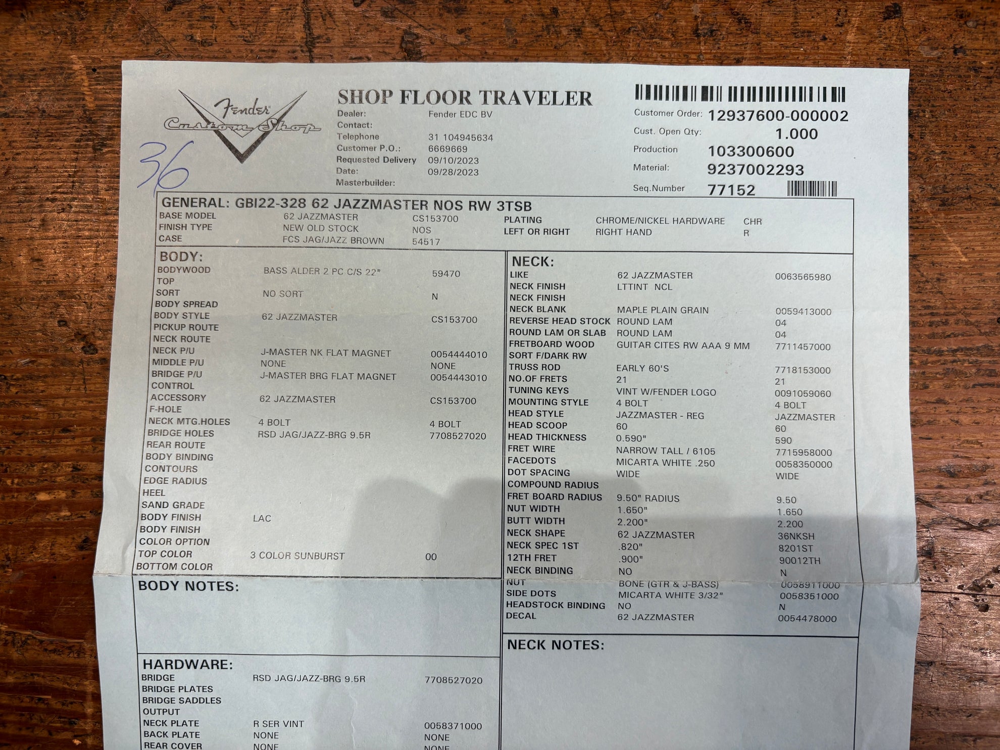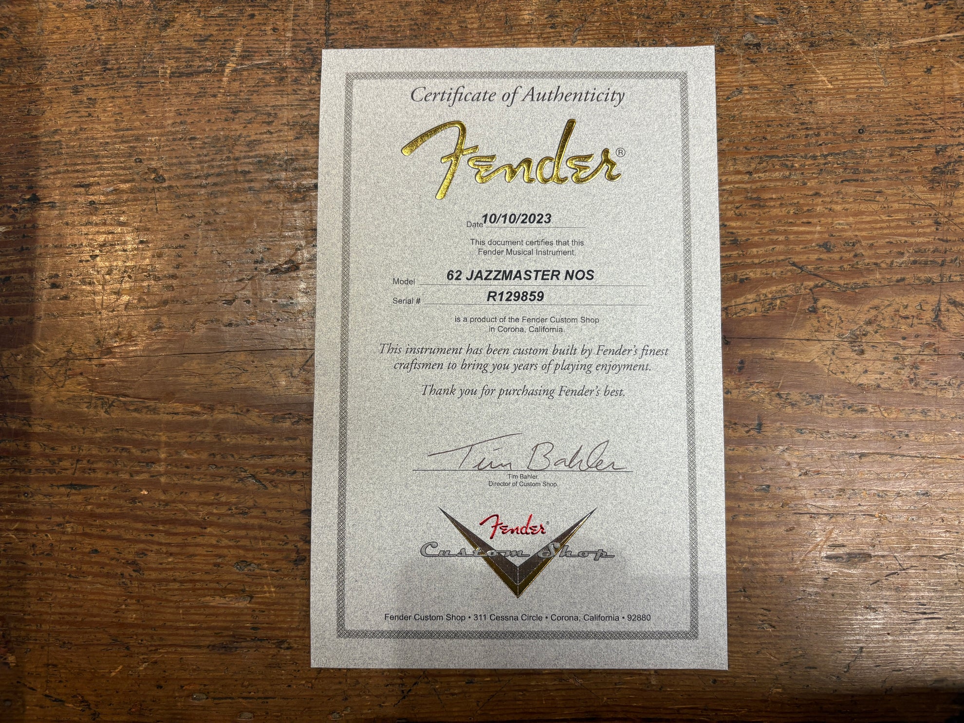 2023 Fender Custom Shop '62 Jazzmaster Reissue NOS Sunburst, in excellent condition - virtually as new. New Old Stock reissue model, with some nice modern updates such as the RSD bridge and a 9.5" radius. The stock Custom Shop Flat Magnet pickups sound fantastic. Includes OHSC, cert and pictured paraphernalia.