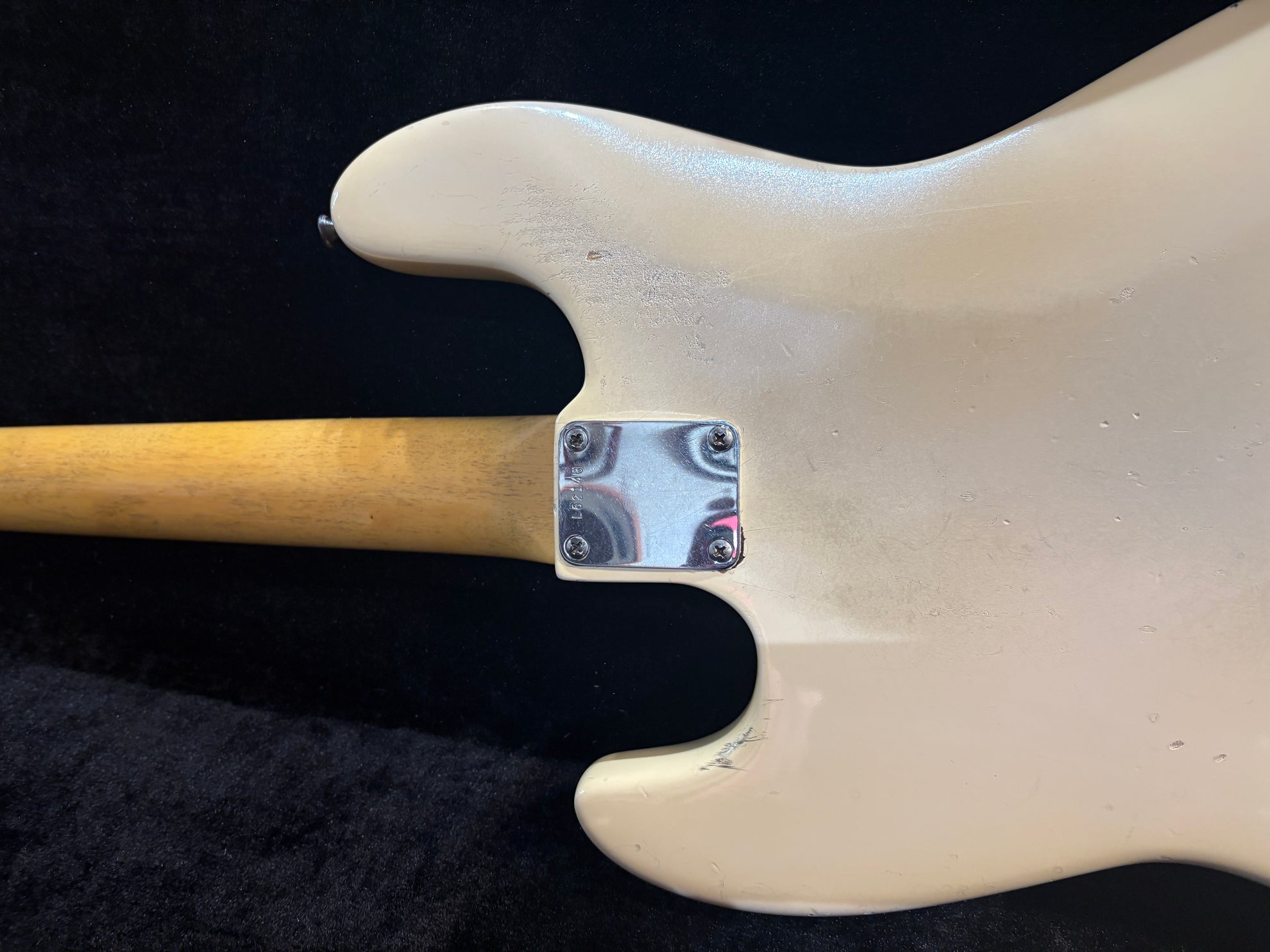 1965 Fender Jazz Bass, very old Olympic White refinish. Full '64 specs, such as clay dots and '64 pots. Such a vibey machine, all original aside from refinish, professional re-fret, added shielding, added capacitor and changed Spitfire pickguard, which looks very authentic - these are a few hundred dollars to order. The original grey bottom pickups sound fantastic. Super light weight. One of the best refinishes we've ever seen, looks very close to vintage Olympic White jazz bases we've had in before. Gorgeous, dark fretboard. Includes a NOHSC, not pictured.