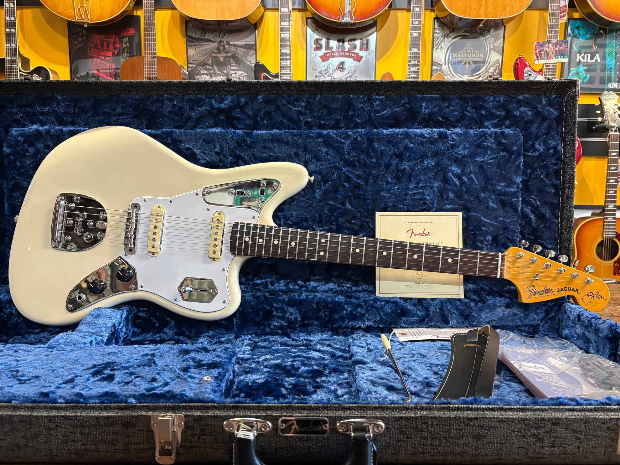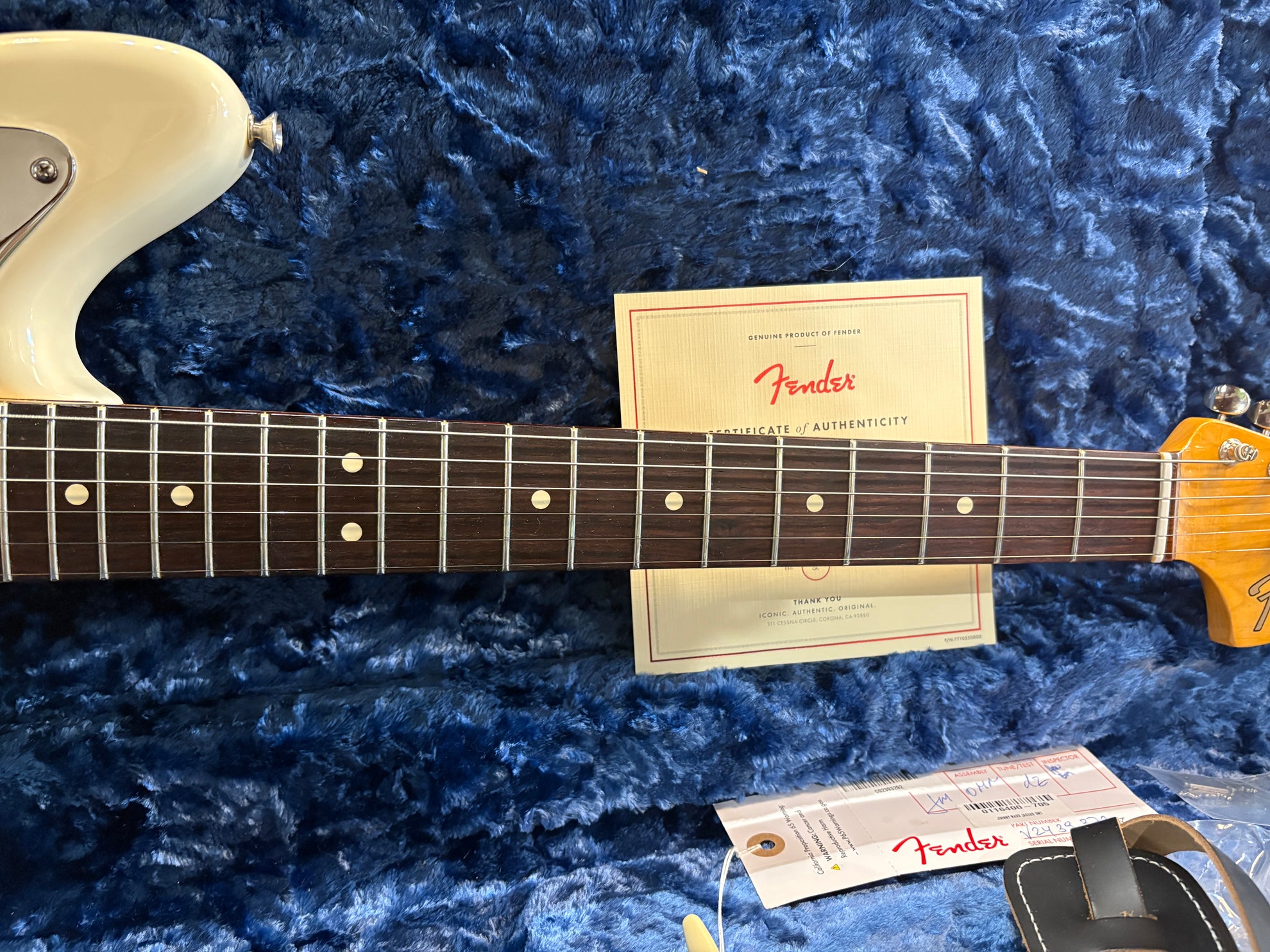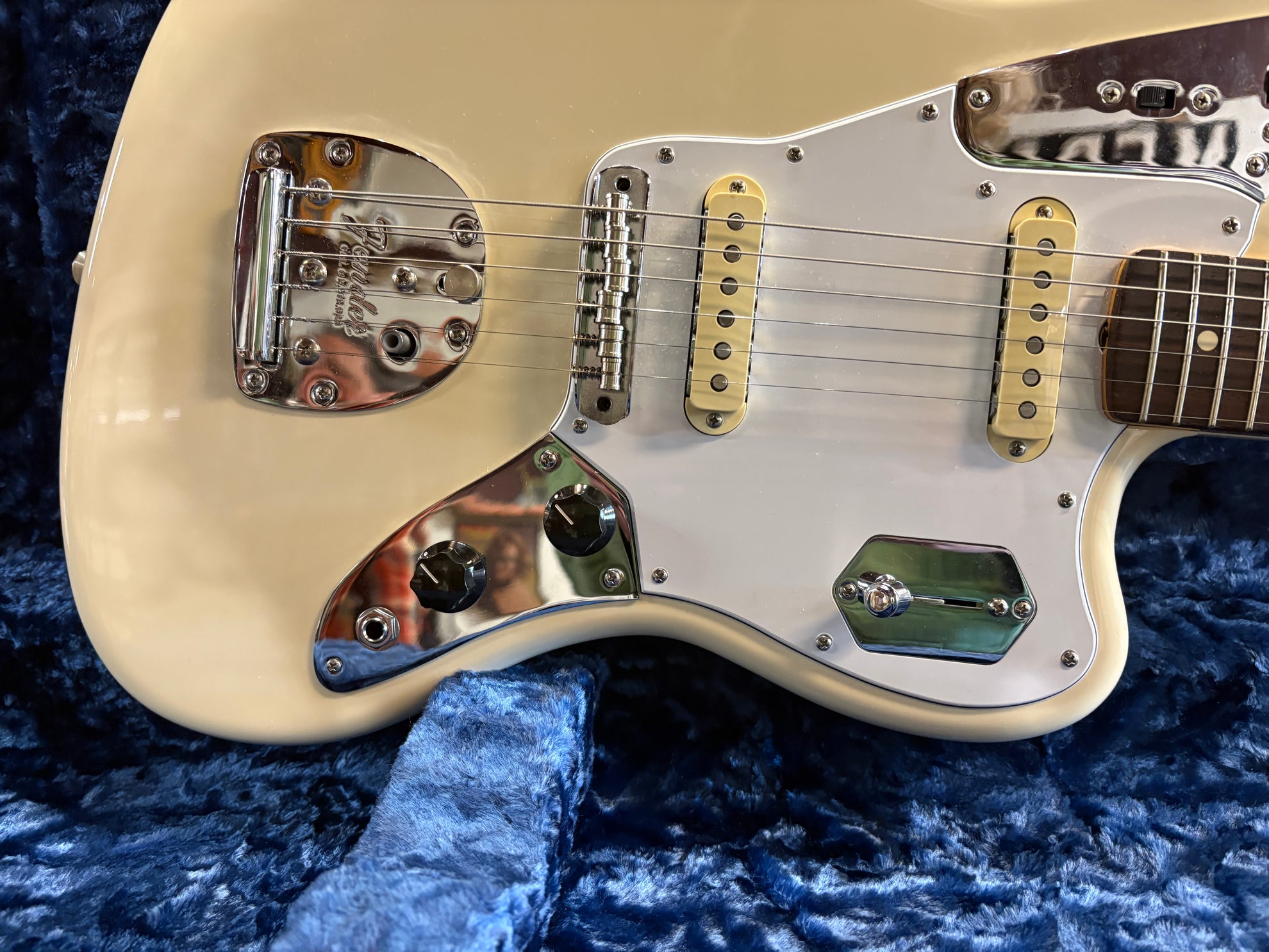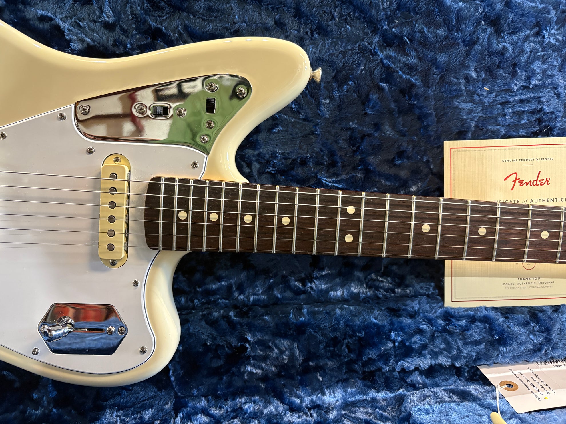 2024 Fender Johnny Marr Jaguar Olympic White, in mint condition. A great player, fully set up - a significant price reduction from a brand new model. Includes OHSC and all pictured paraphernalia.