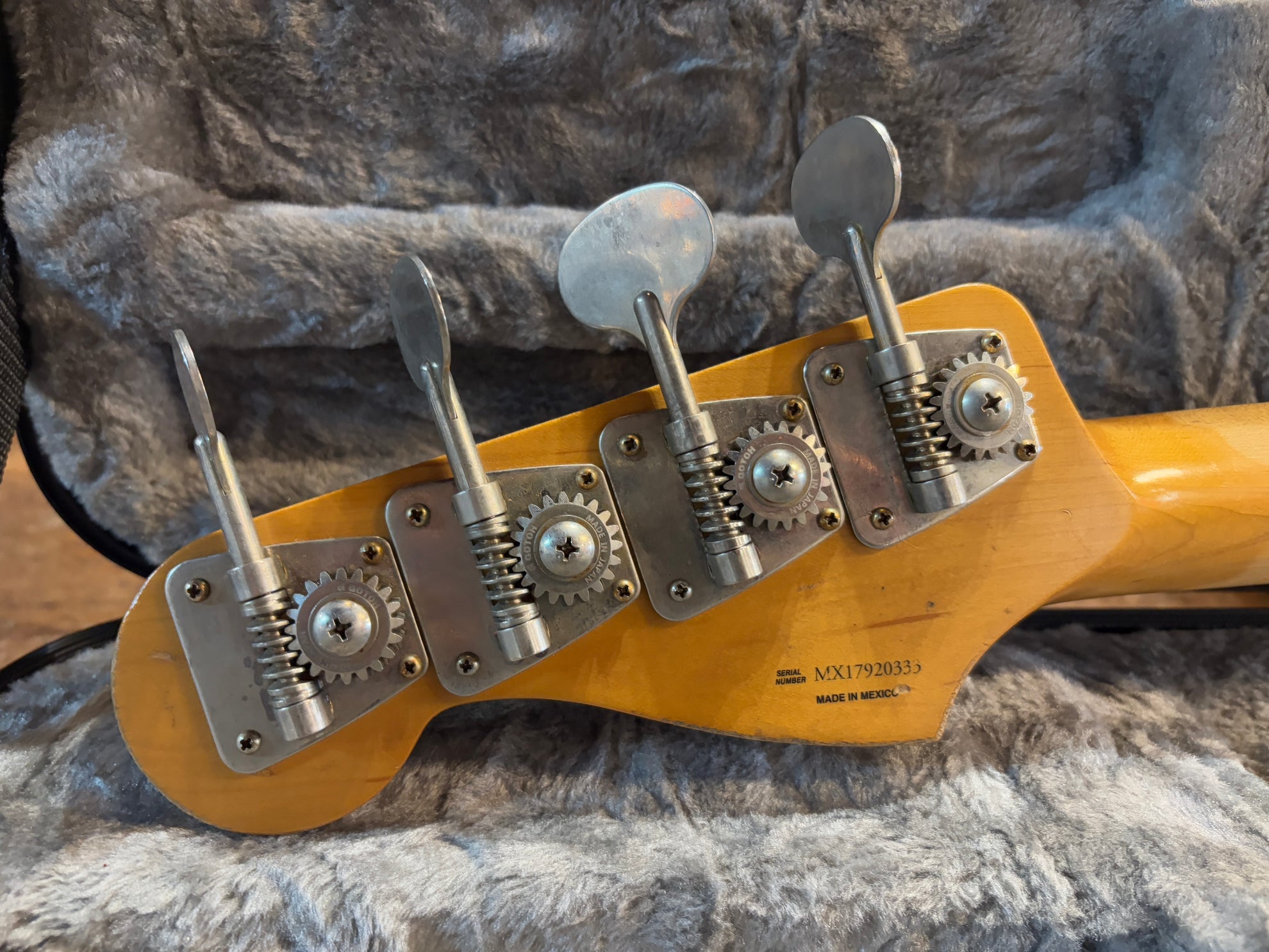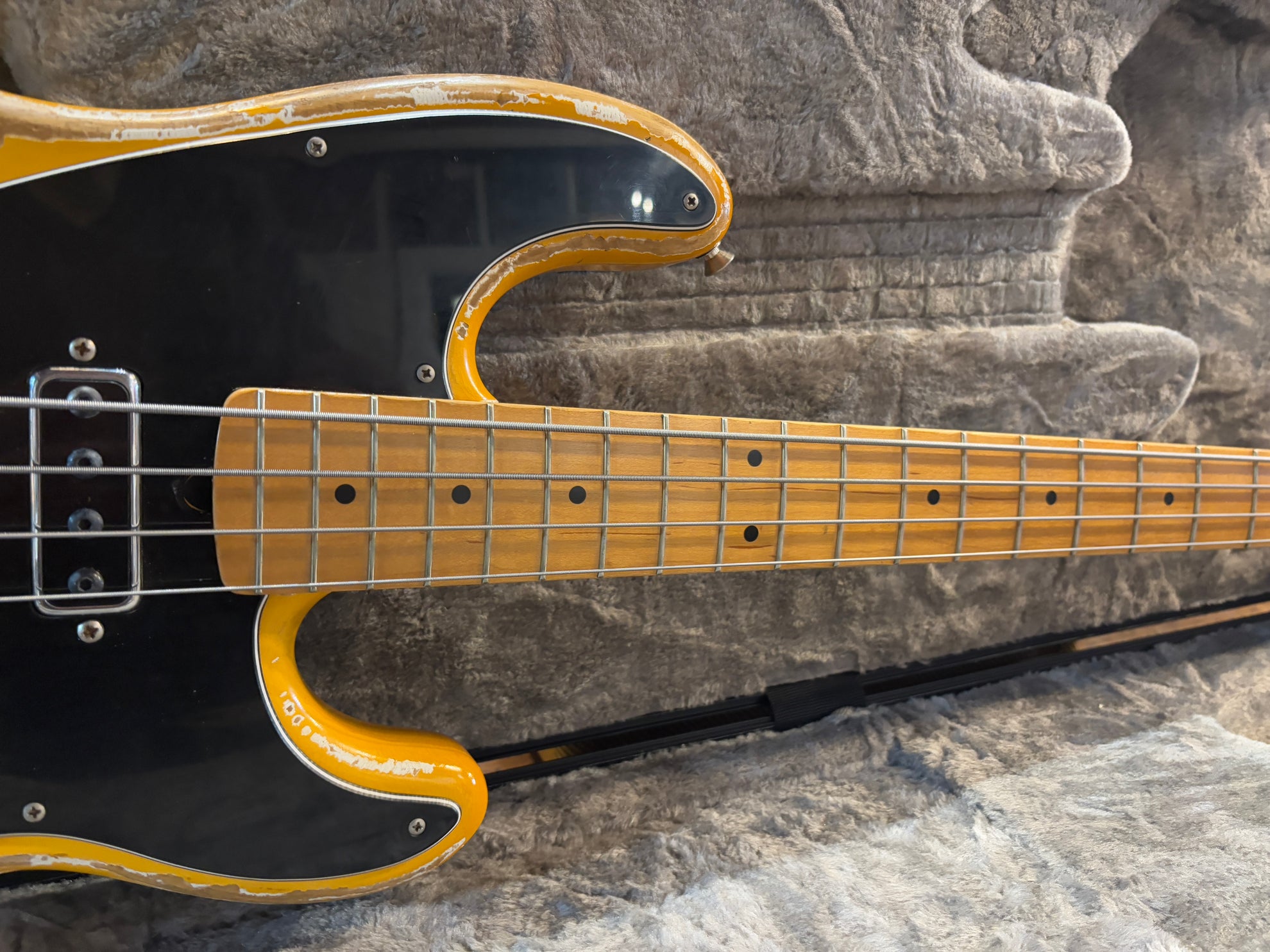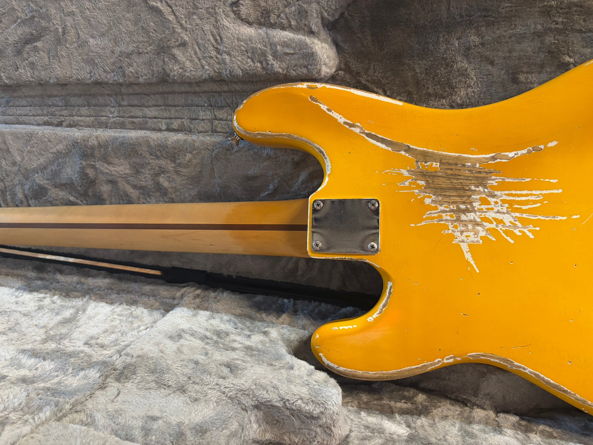 Fender/MJT '50's Style Precision Bass Partscaster, a seriously unique machine! A cool partscaster constructed with a Fender Mexican Roadworn '50's Precision Bass neck and a custom colour MJT body. Loaded with '70's DiMarzio P-Bass pickups and a Roswell Rickenbacker style neck pickup. Gotoh Lollipop tuners. An overall great looking and sounding bass. Includes a gig bag.