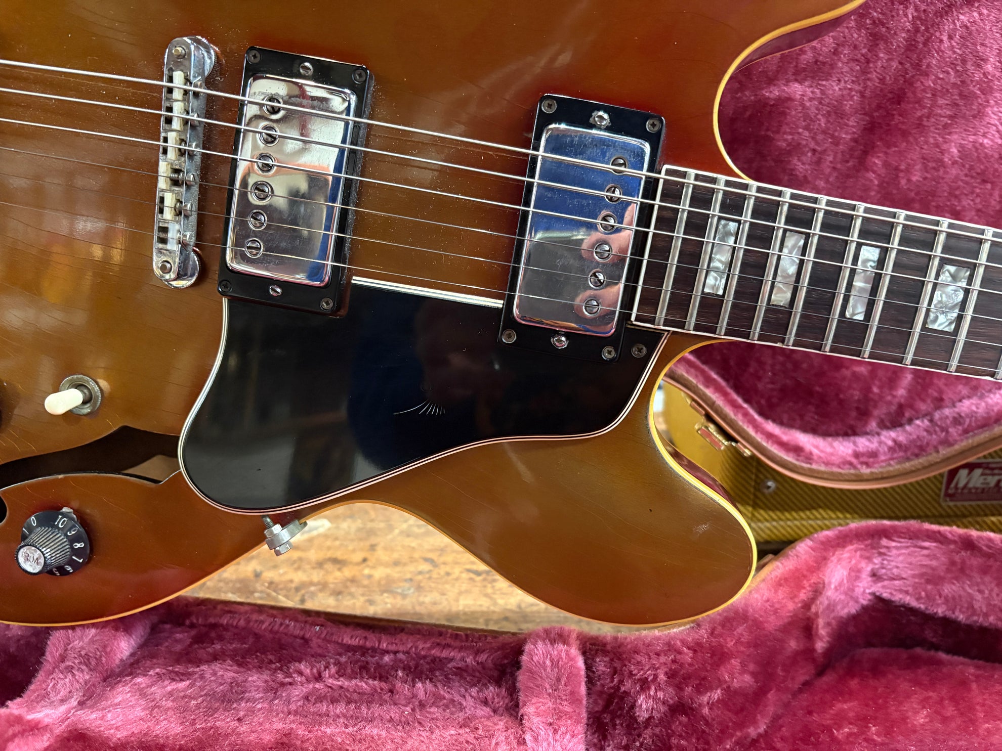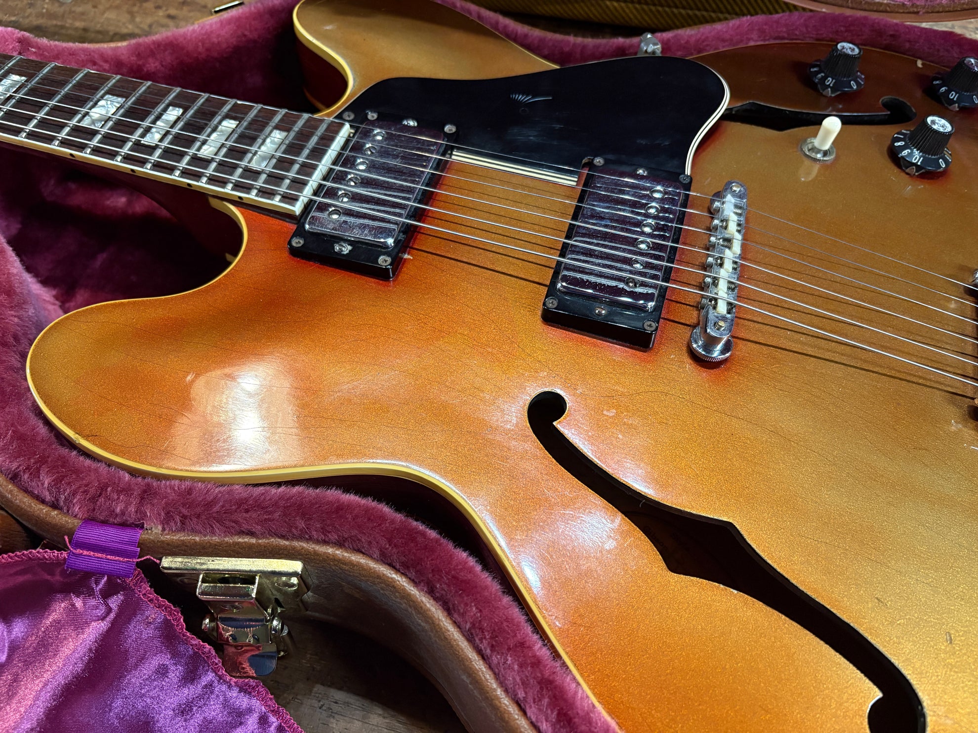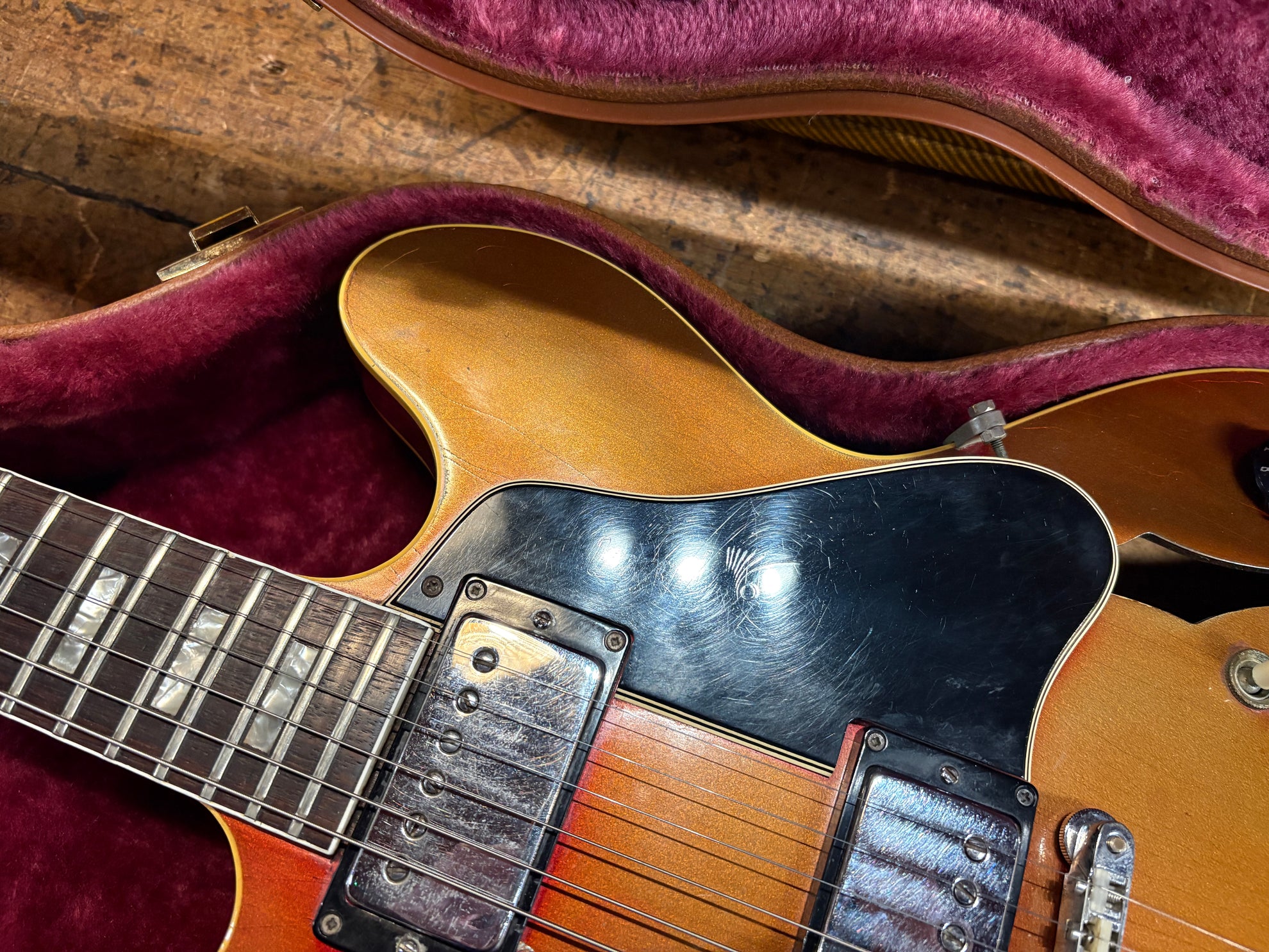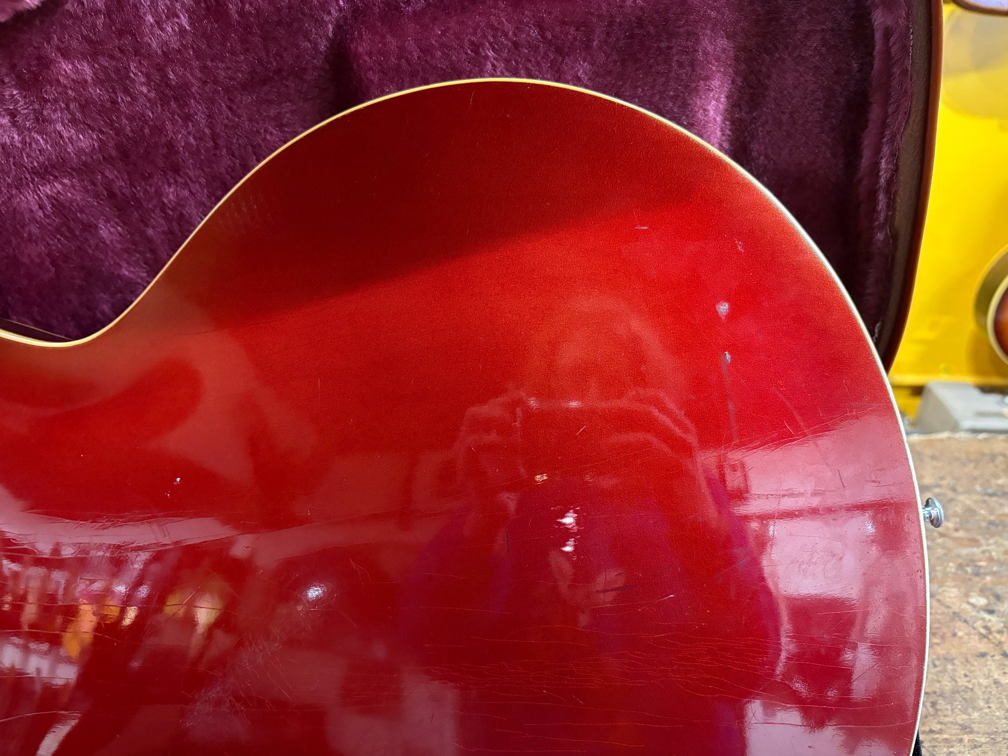 1968 Gibson ES-335 Sparkling Burgundy, in overall great vintage condition. Super rare factory custom colour Sparkling Burgundy, which has patina'd in a gorgeous way over years of play, with some really nice checking coming through - the back of the body still retains its original hue. One of the lightest 335's we have had in years at only 7.5lbs. All original aside from changed tuners and high E saddle. Includes a NOHSC.