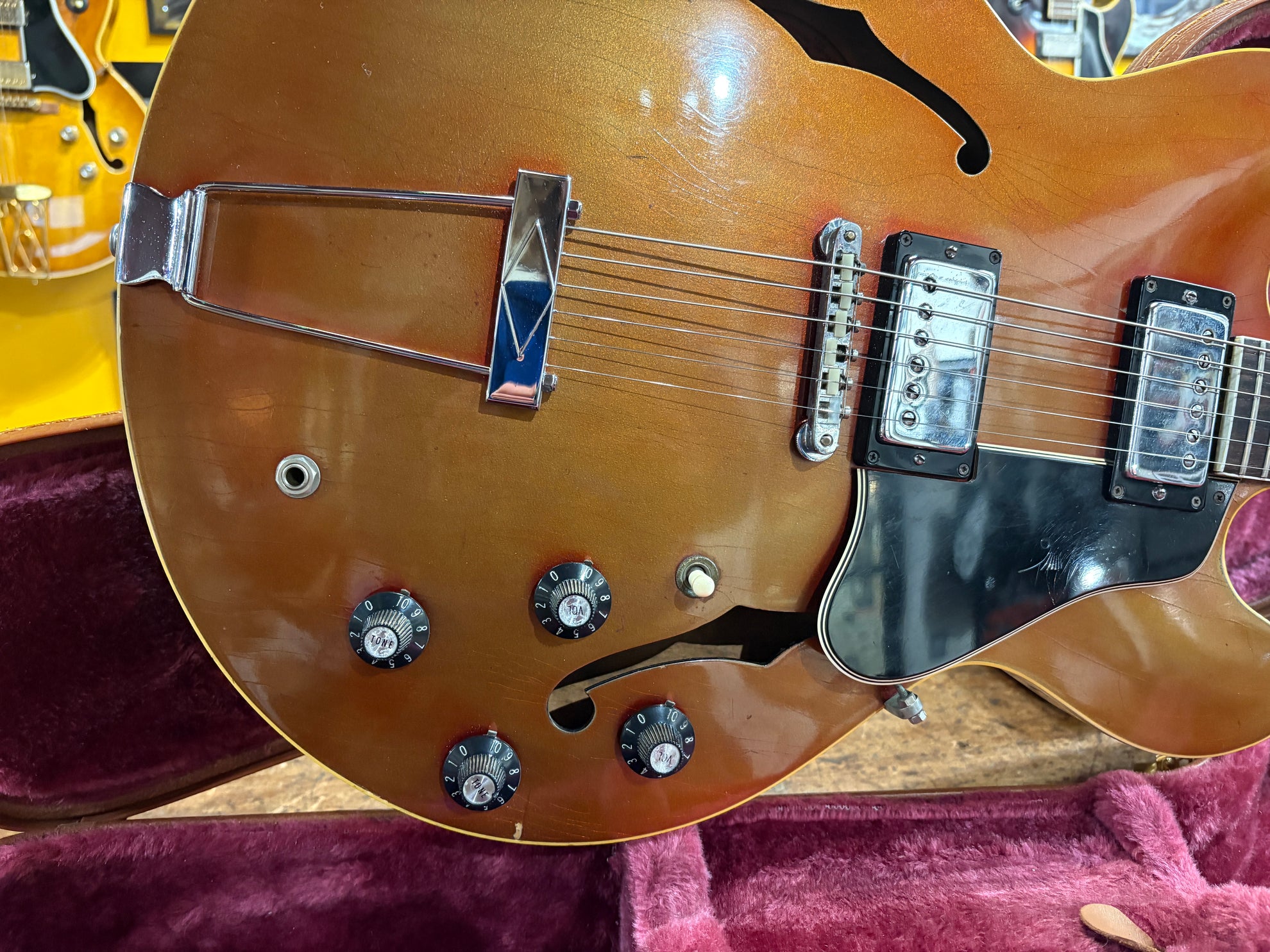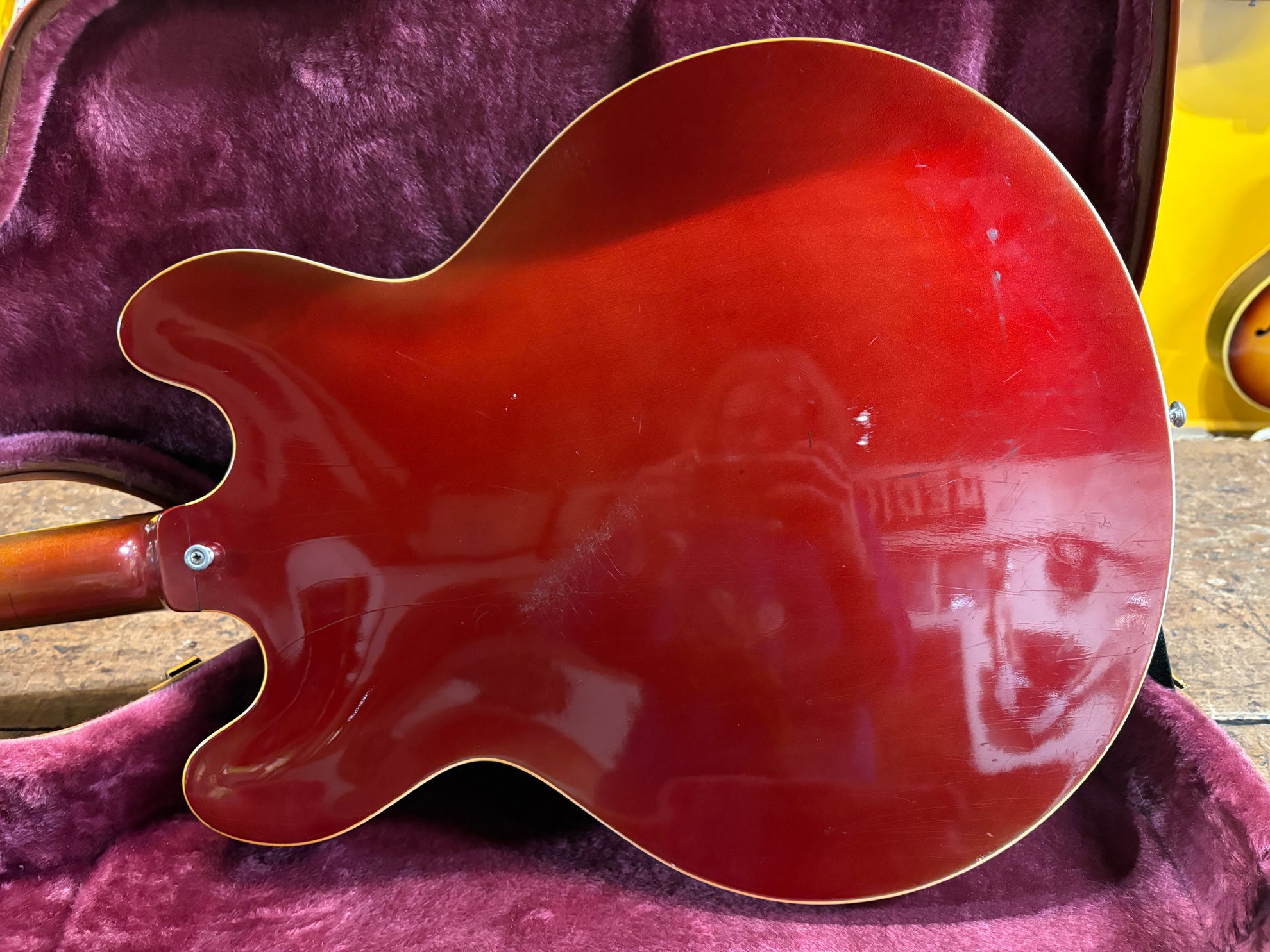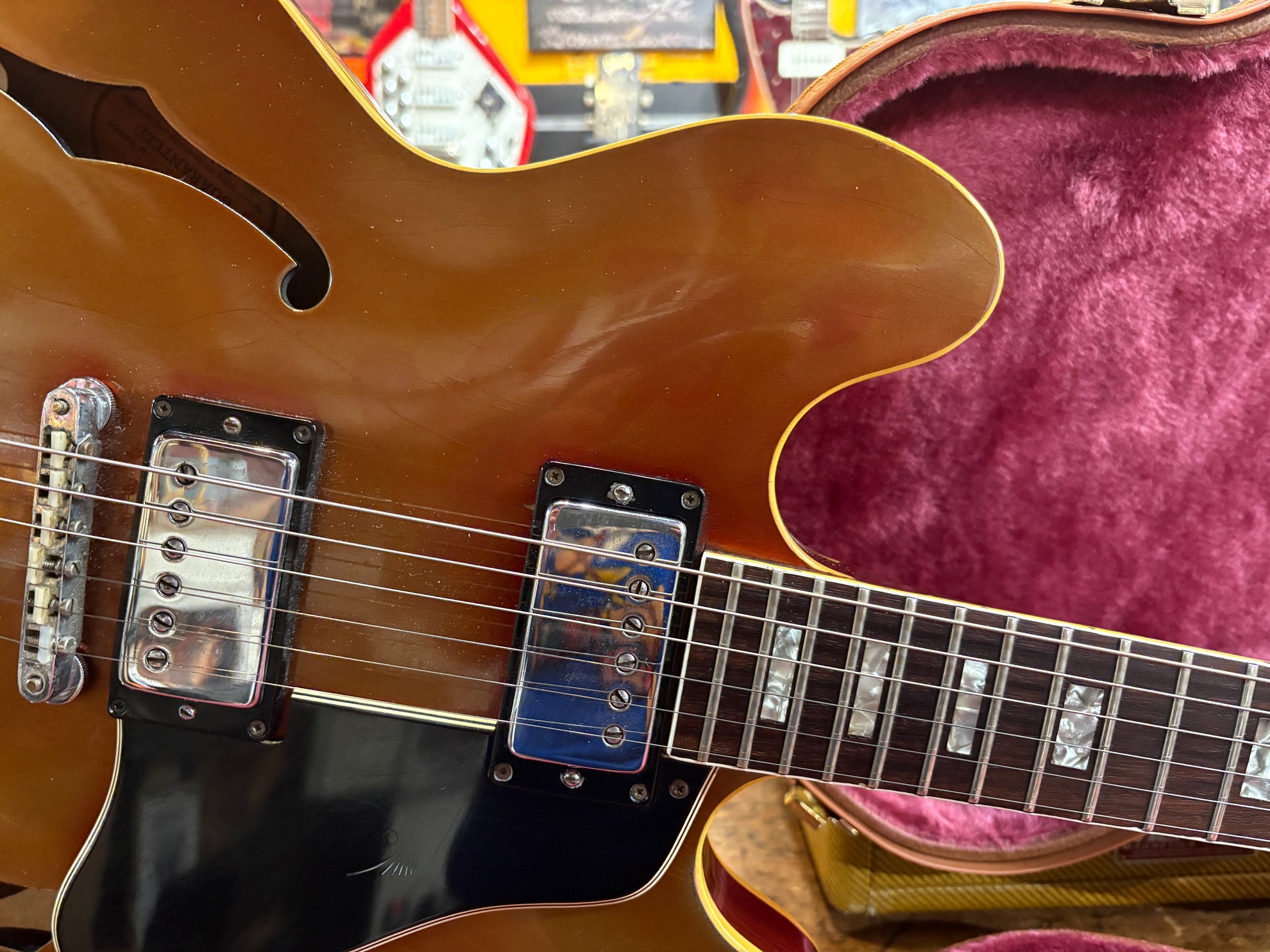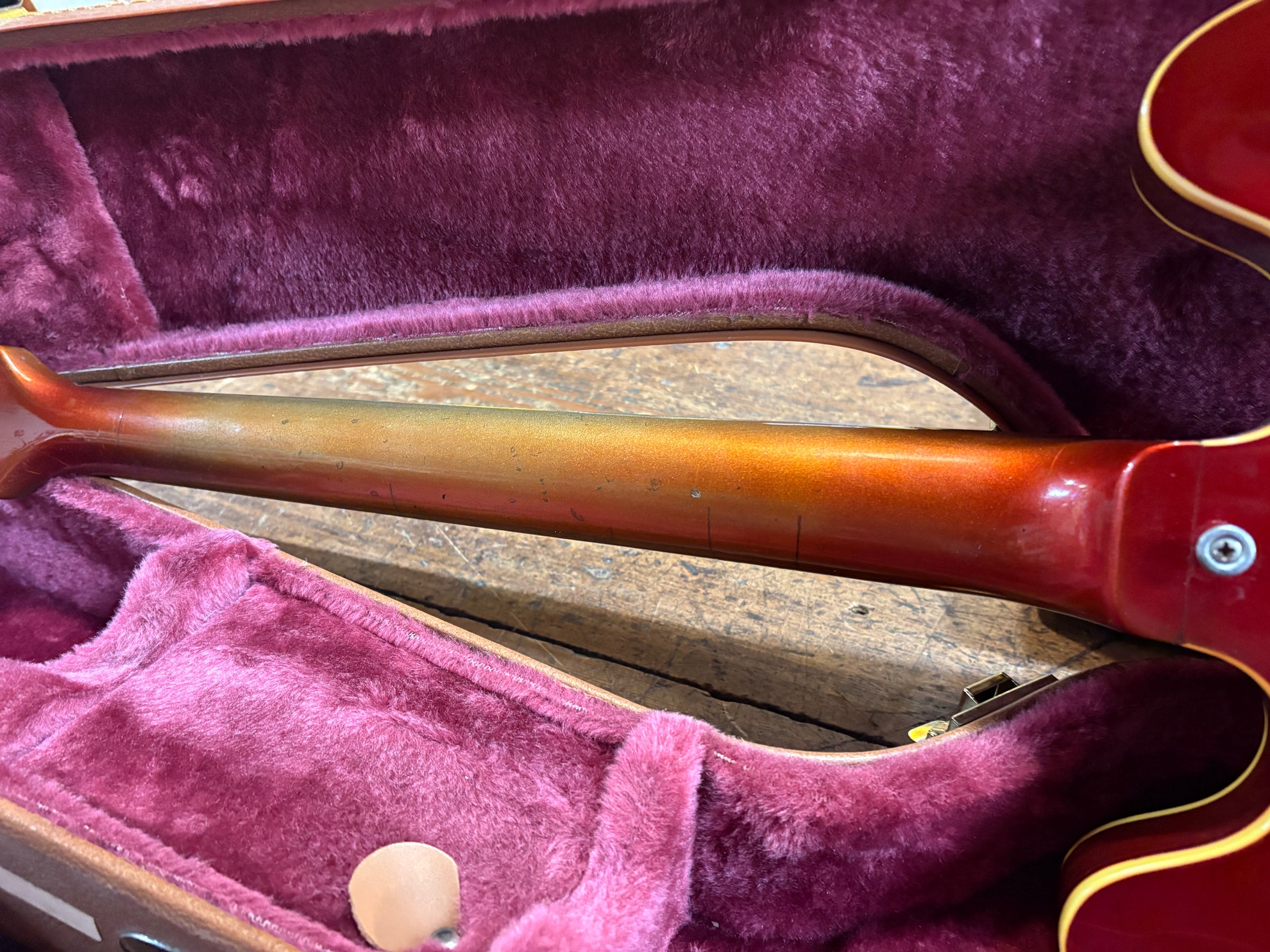 1968 Gibson ES-335 Sparkling Burgundy, in overall great vintage condition. Super rare factory custom colour Sparkling Burgundy, which has patina'd in a gorgeous way over years of play, with some really nice checking coming through - the back of the body still retains its original hue. One of the lightest 335's we have had in years at only 7.5lbs. All original aside from changed tuners and high E saddle. Includes a NOHSC.