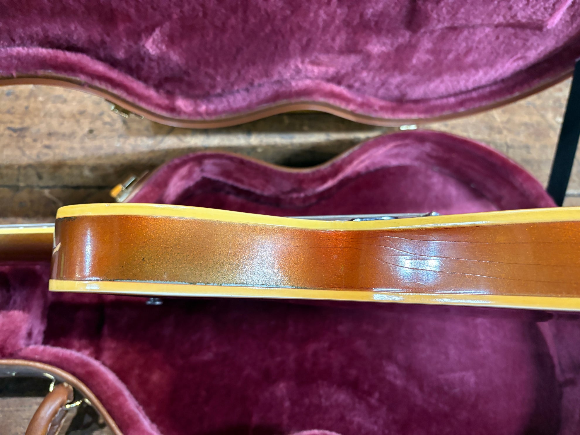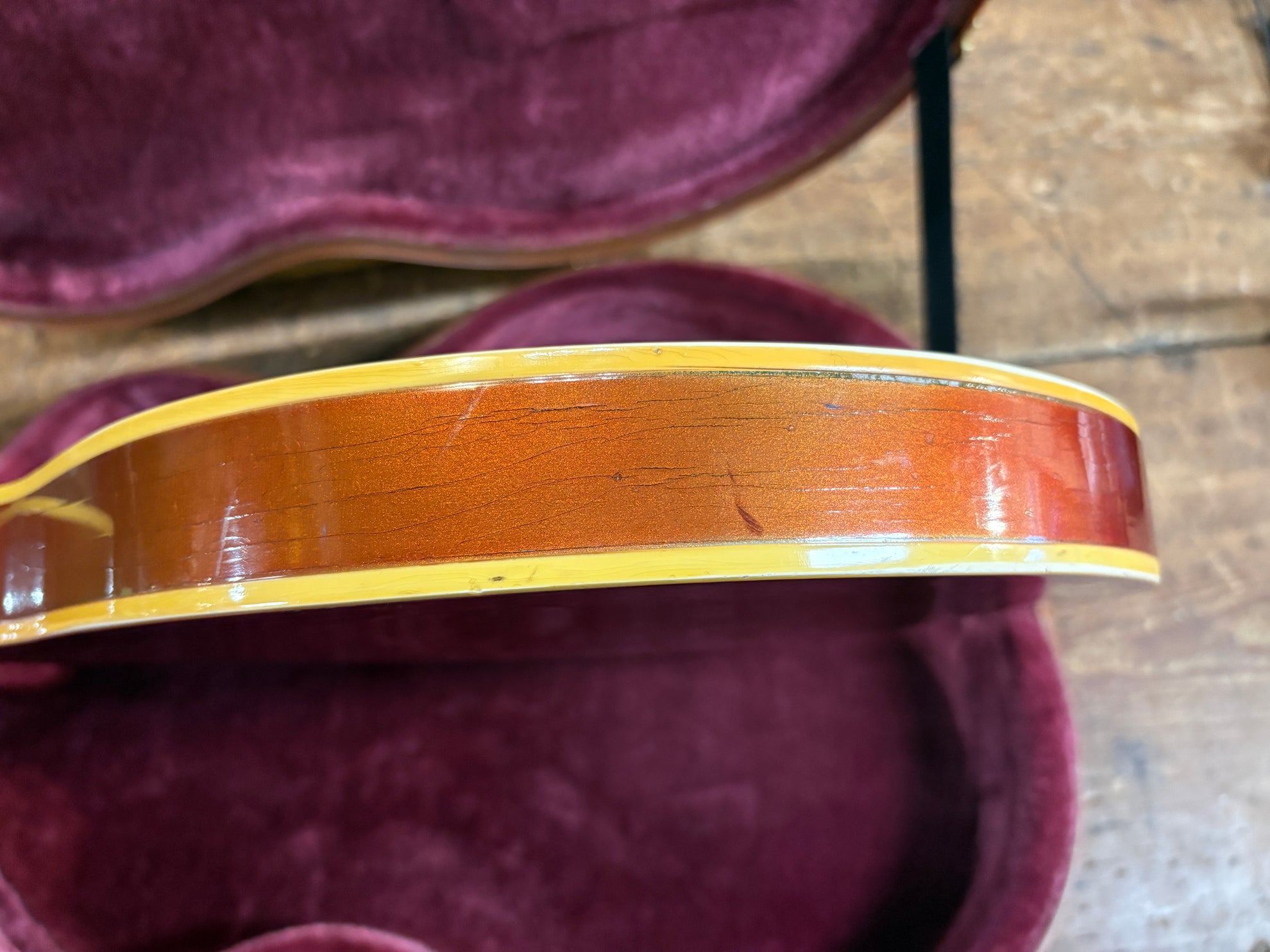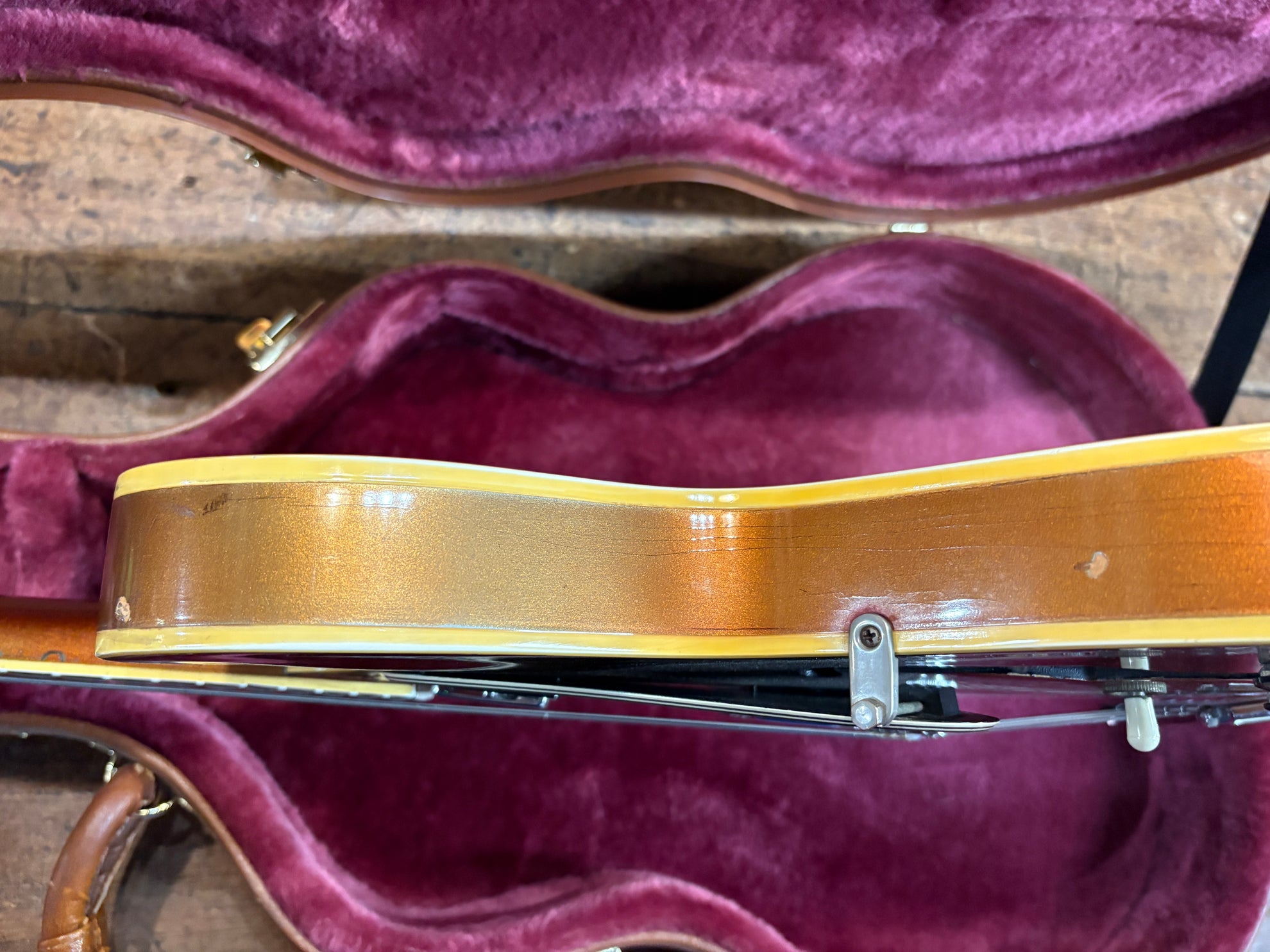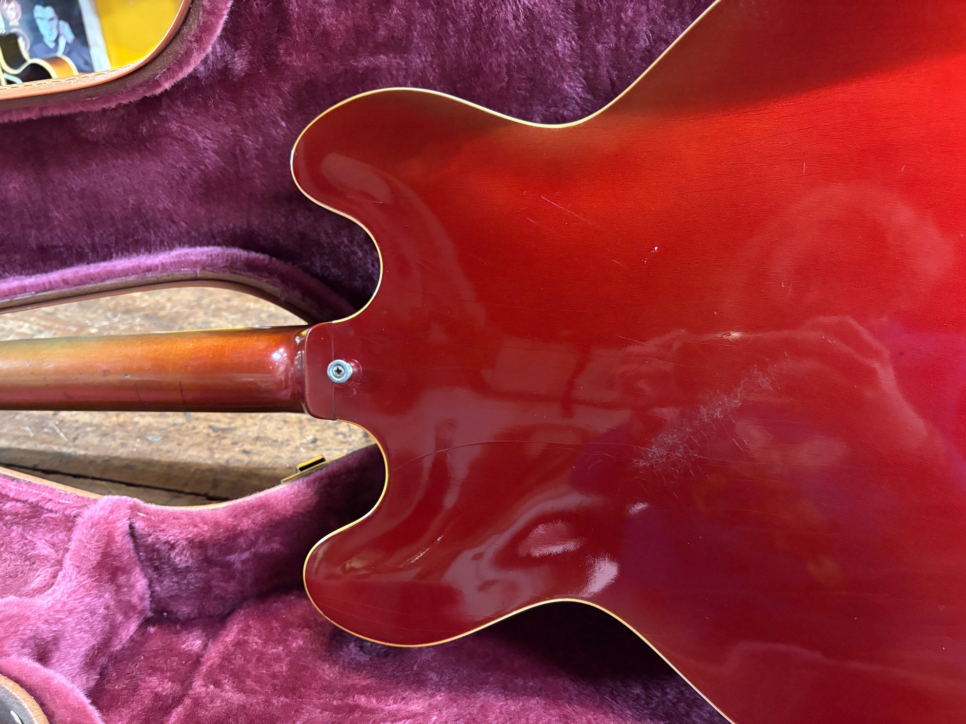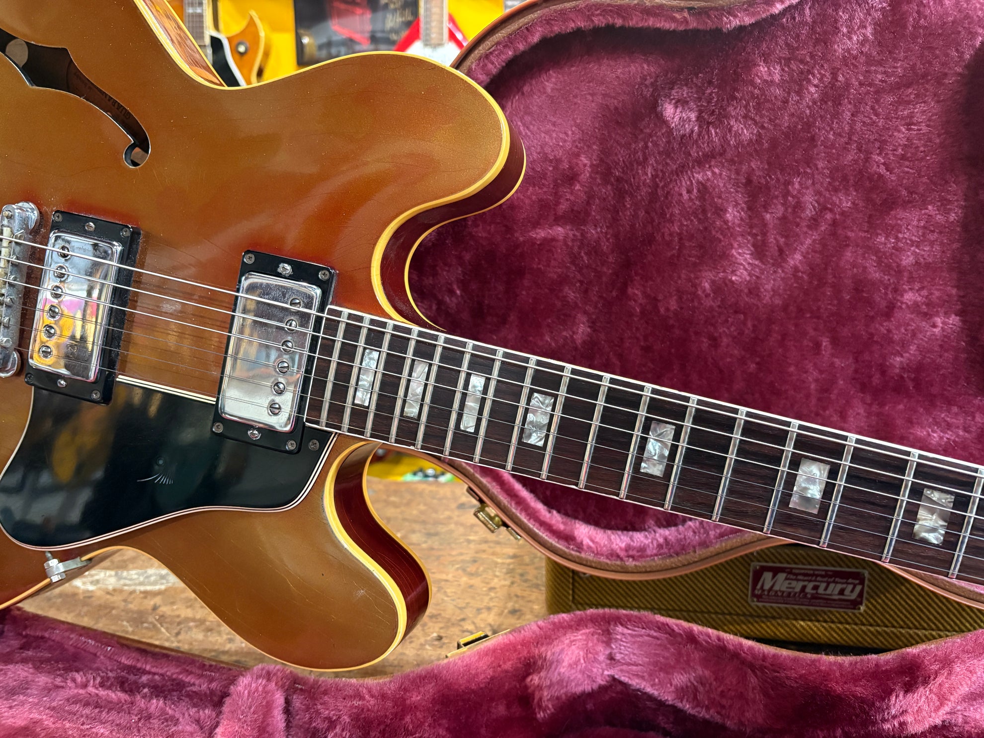 1968 Gibson ES-335 Sparkling Burgundy, in overall great vintage condition. Super rare factory custom colour Sparkling Burgundy, which has patina'd in a gorgeous way over years of play, with some really nice checking coming through - the back of the body still retains its original hue. One of the lightest 335's we have had in years at only 7.5lbs. All original aside from changed tuners and high E saddle. Includes a NOHSC.