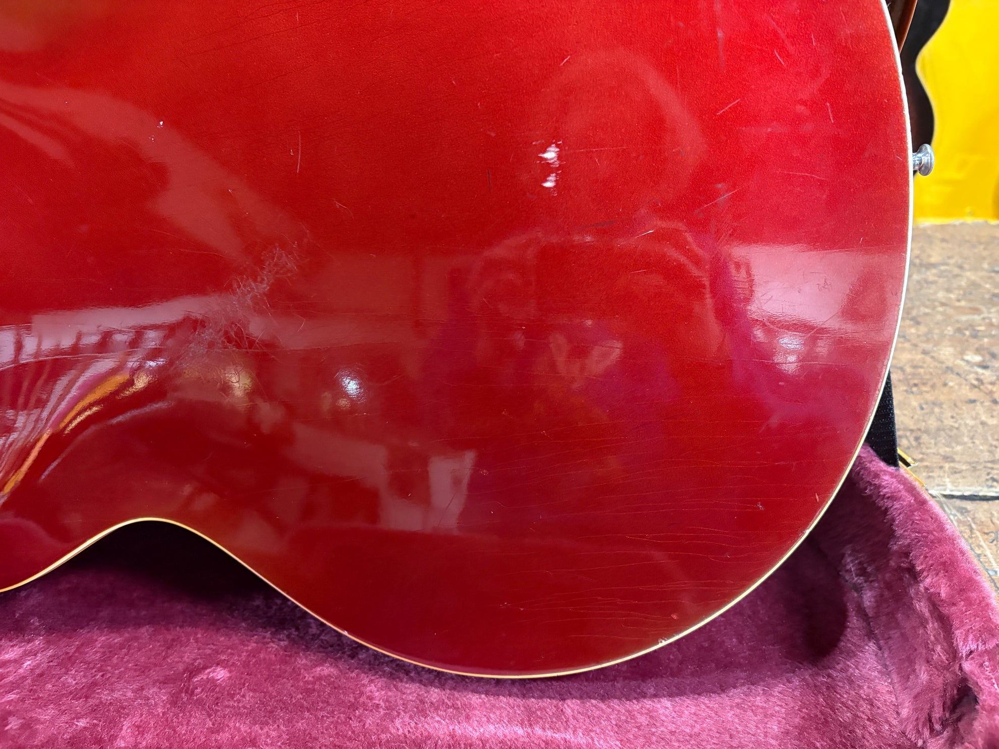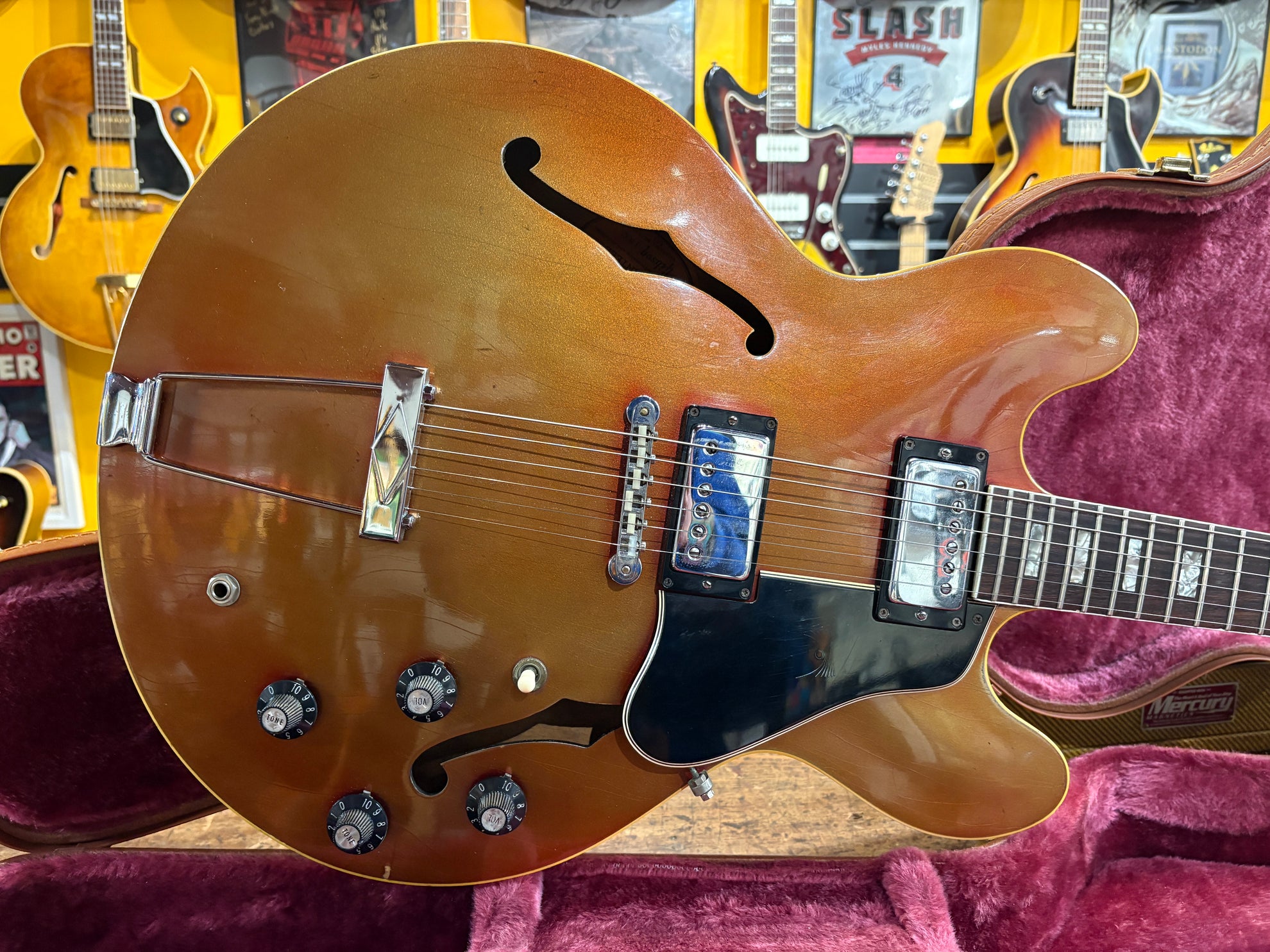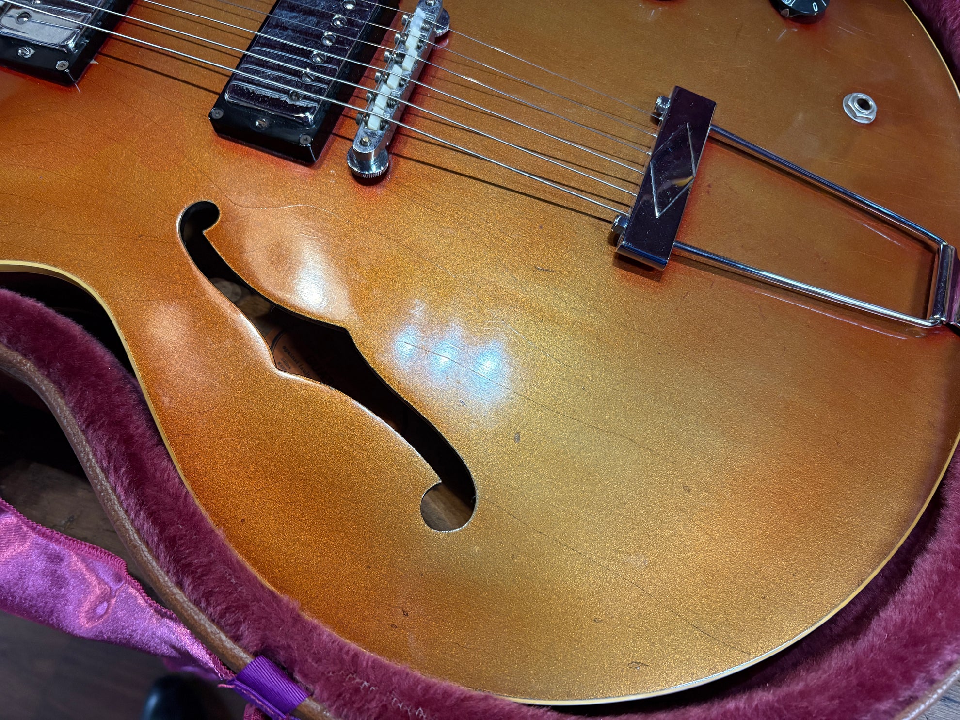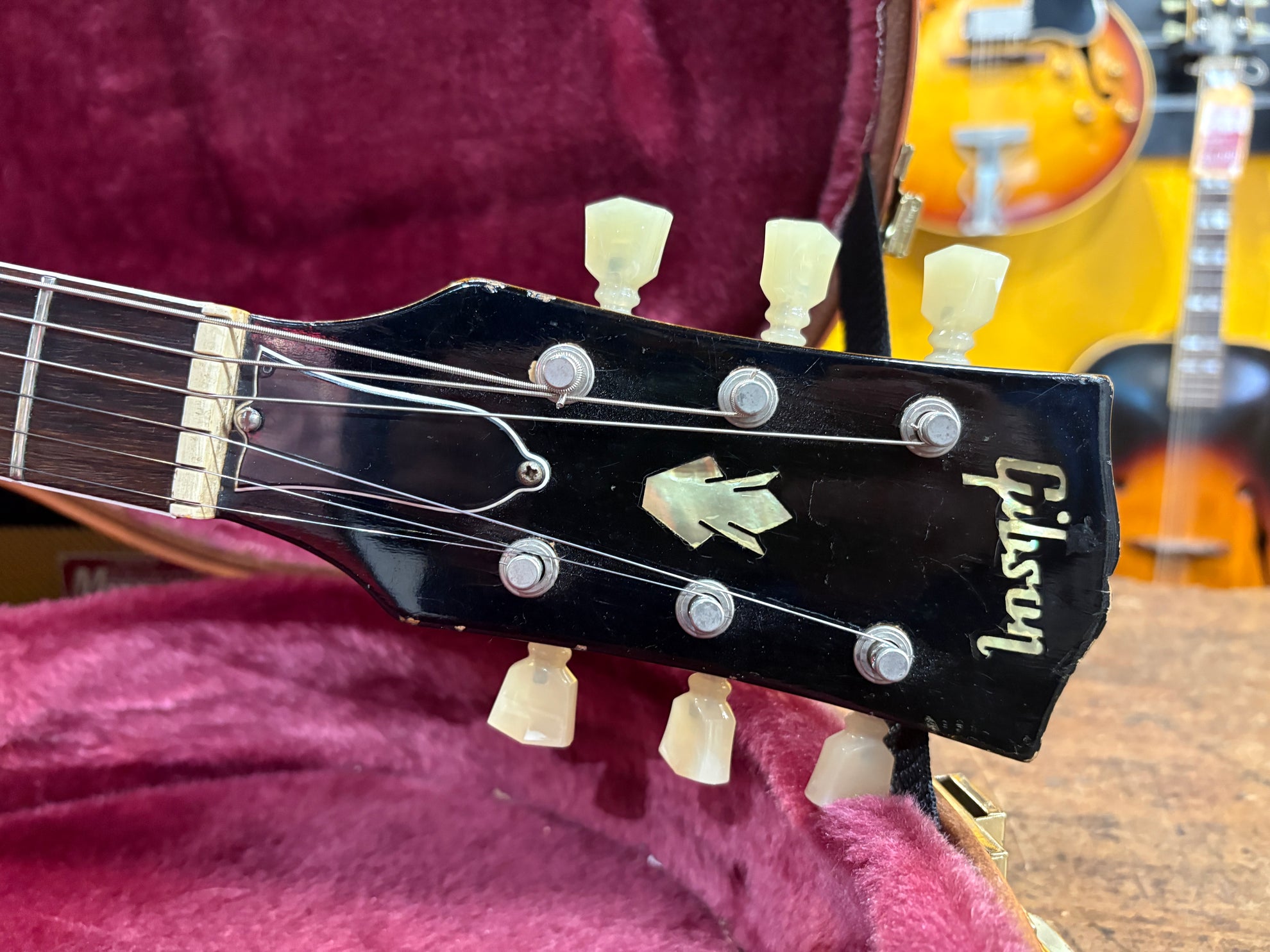 1968 Gibson ES-335 Sparkling Burgundy, in overall great vintage condition. Super rare factory custom colour Sparkling Burgundy, which has patina'd in a gorgeous way over years of play, with some really nice checking coming through - the back of the body still retains its original hue. One of the lightest 335's we have had in years at only 7.5lbs. All original aside from changed tuners and high E saddle. Includes a NOHSC.