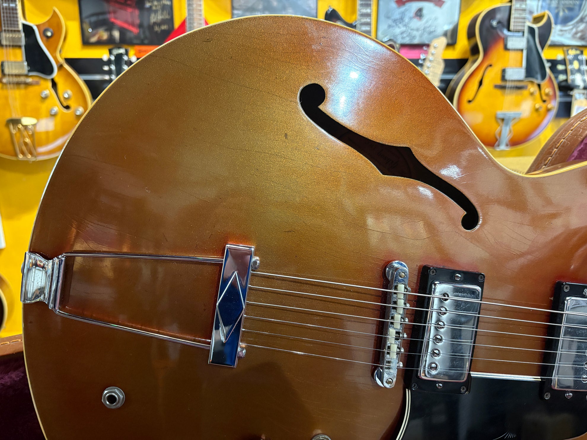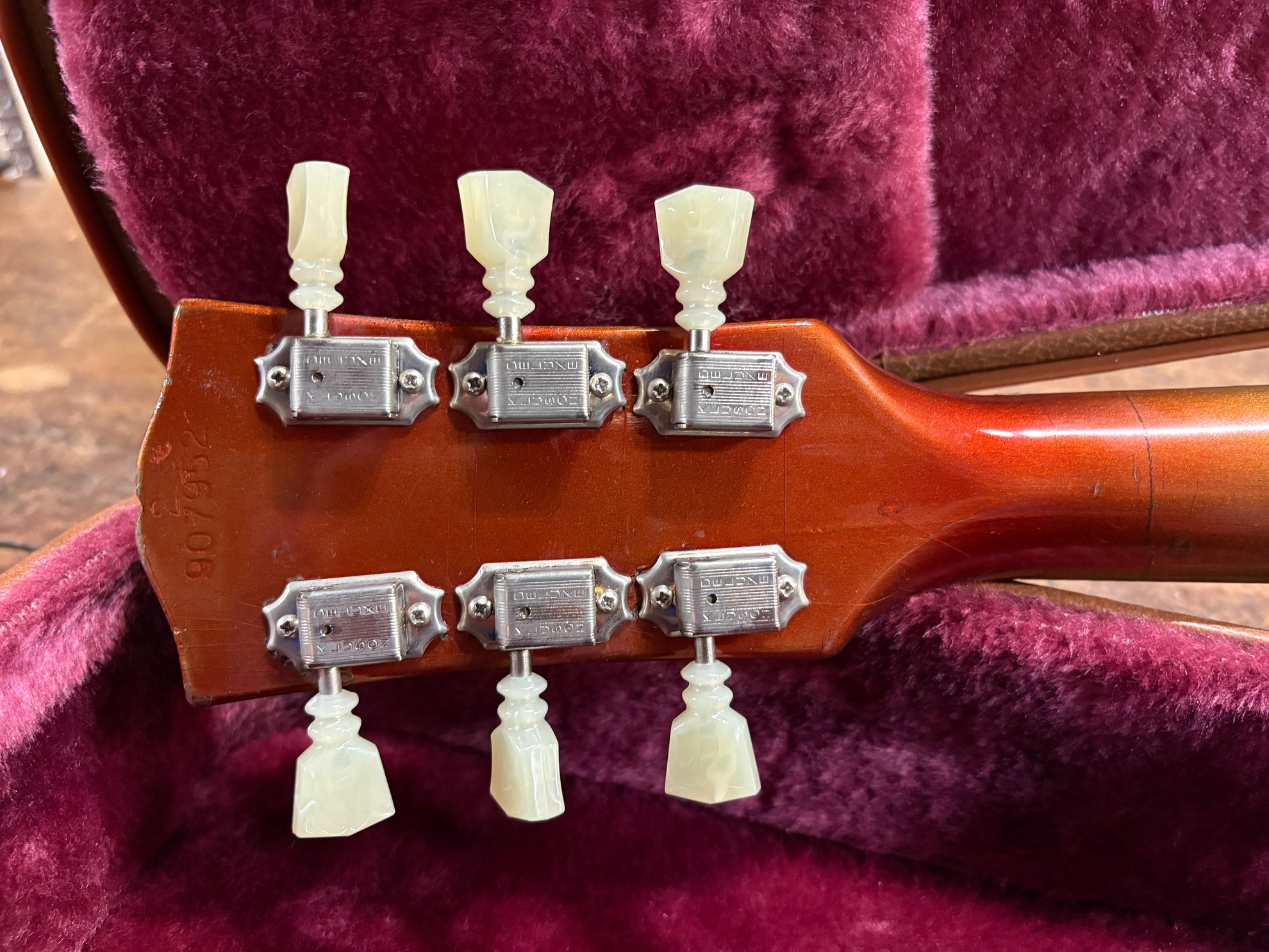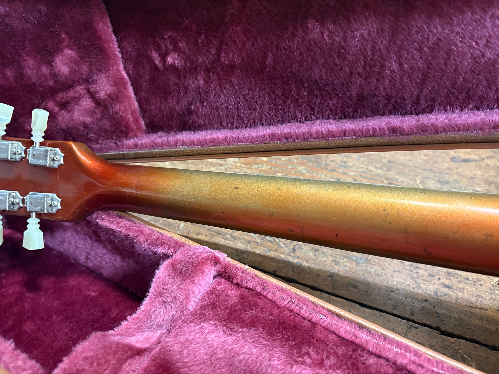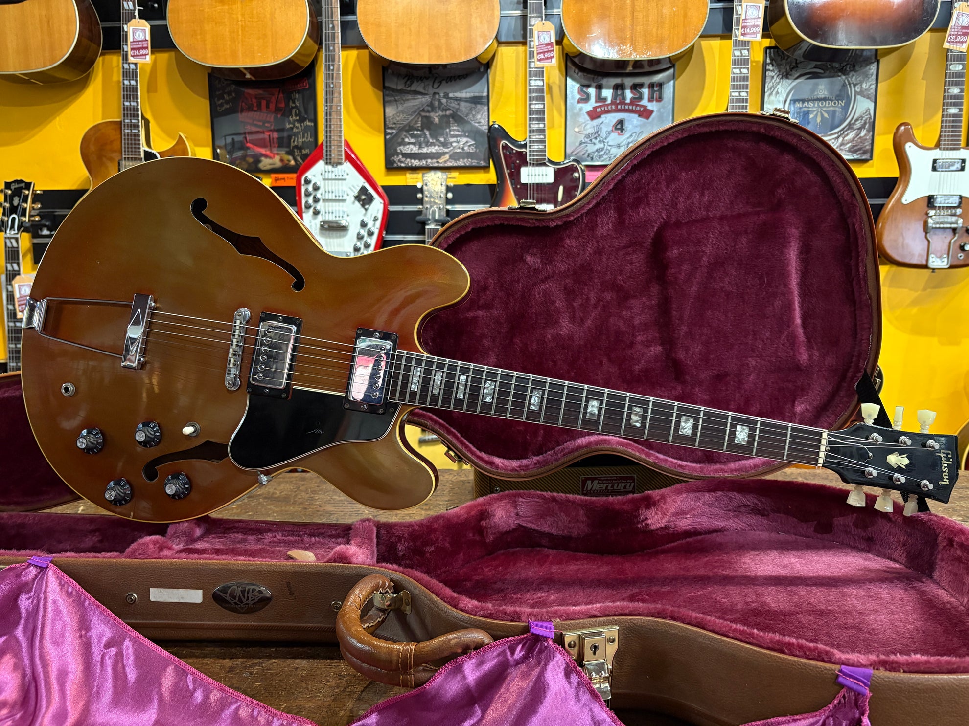 1968 Gibson ES-335 Sparkling Burgundy, in overall great vintage condition. Super rare factory custom colour Sparkling Burgundy, which has patina'd in a gorgeous way over years of play, with some really nice checking coming through - the back of the body still retains its original hue. One of the lightest 335's we have had in years at only 7.5lbs. All original aside from changed tuners and high E saddle. Includes a NOHSC.