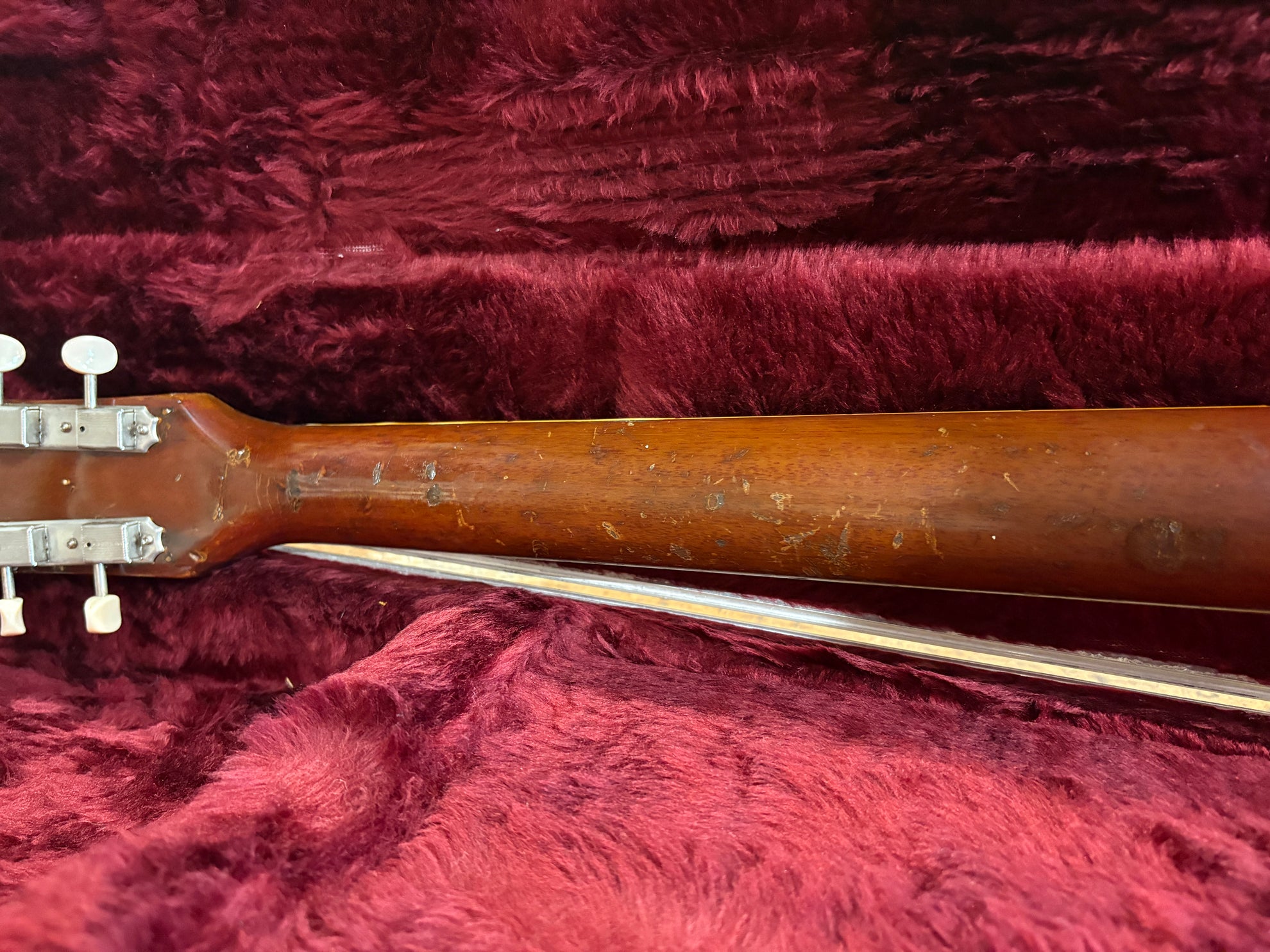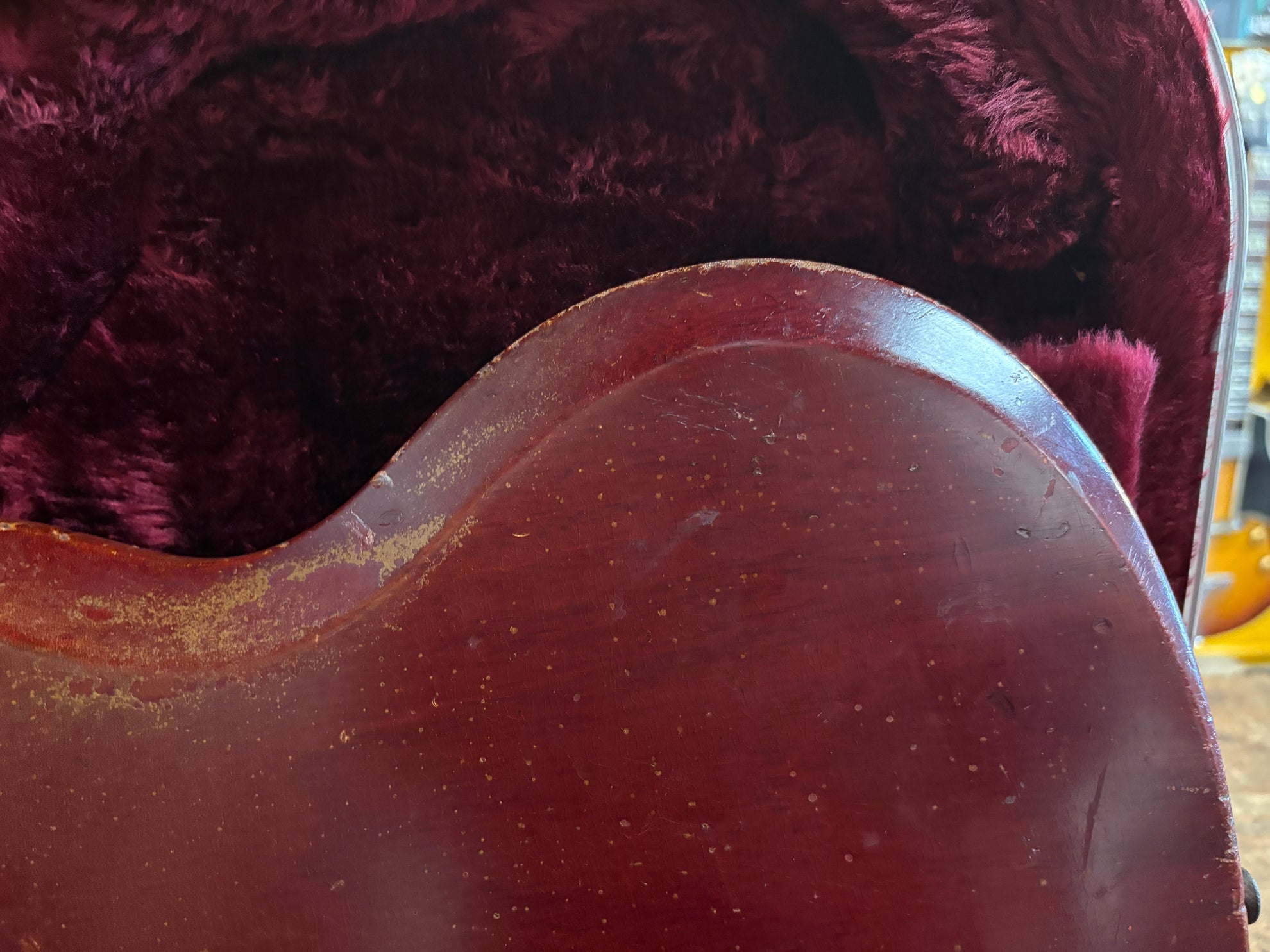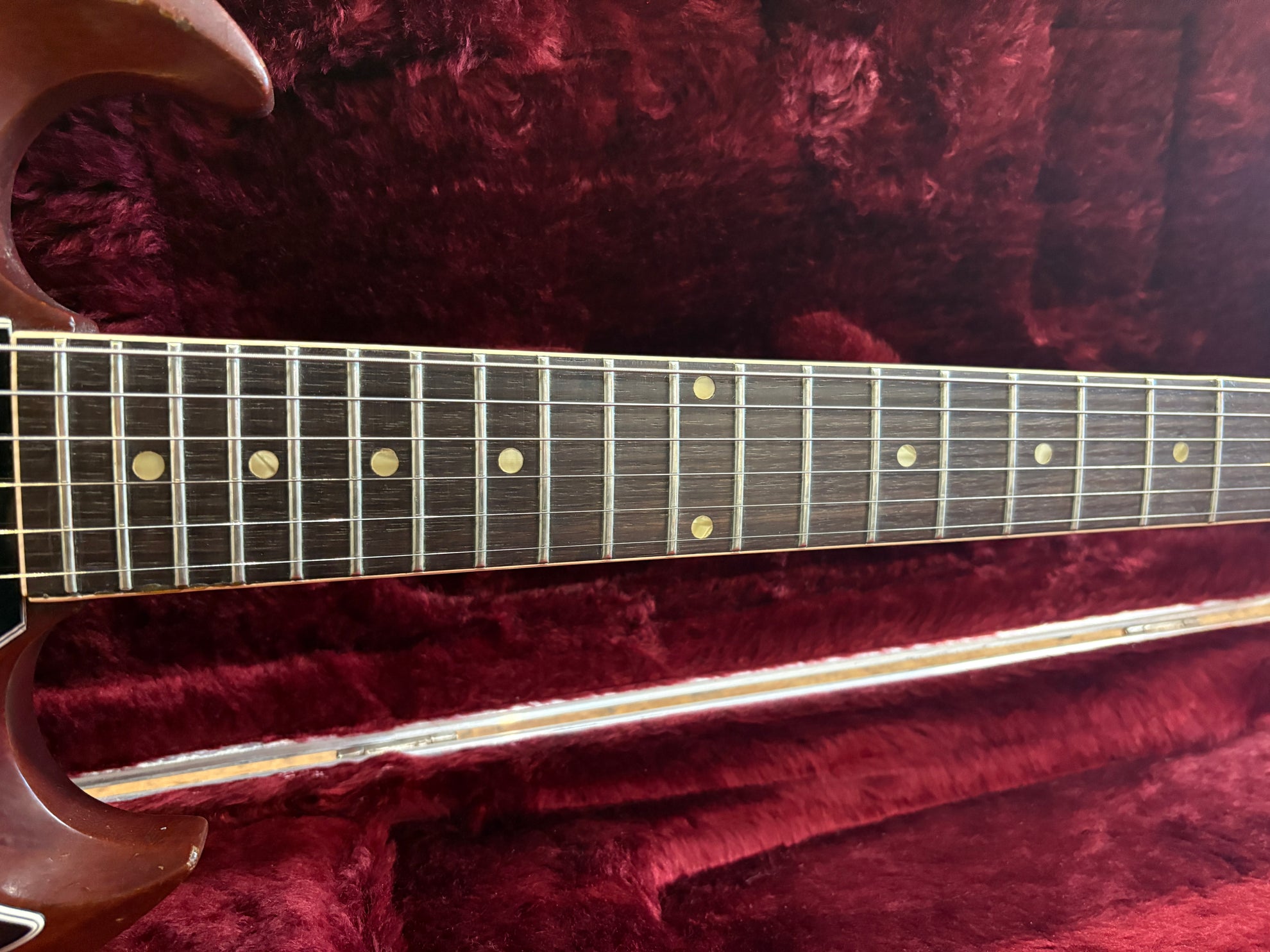 1962 Gibson SG Special Cherry, a seriously cool players grade piece. What a cool machine! This one has quite a few changes due to a life of being heavily played, leading to a friendlier price for a fantastic vintage Gibson. The guitar has had a full overspray, but no breaks or repairs are visible. Changed bridge and studs, different tuners previously installed. The pickups and pots are original, wiring capacitors have been changed. Still on the original frets, with roughly 70% life left. Changed bone nut. The original pickups sound fantastic. Includes a NOHSC.
