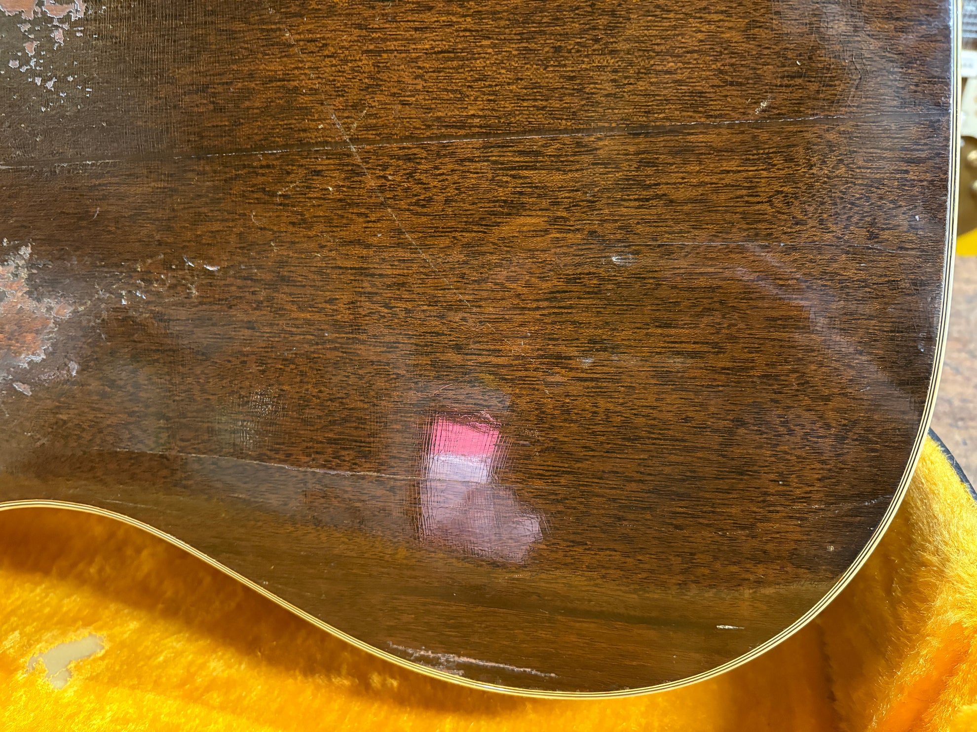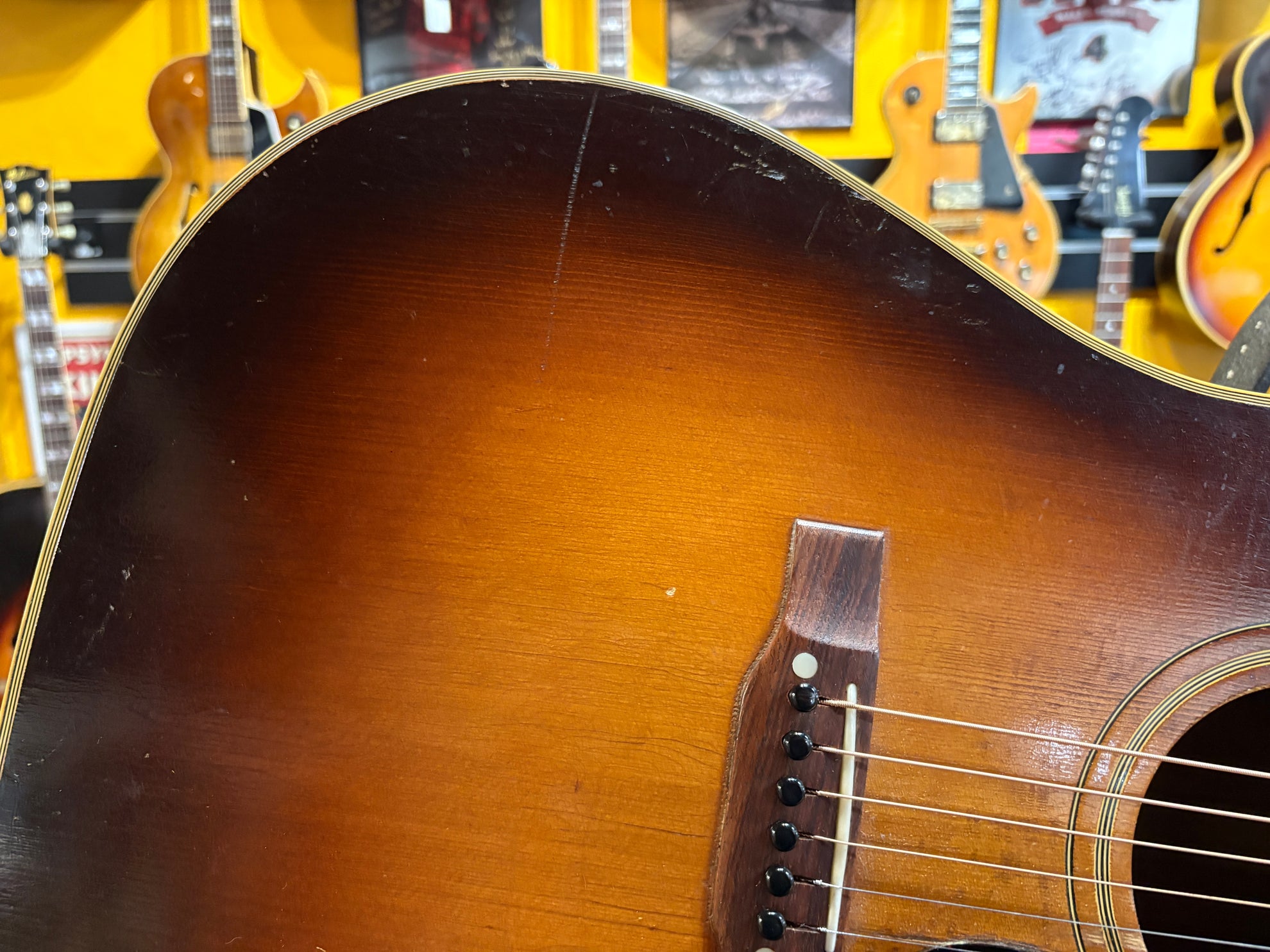1943 Gibson Southern Jumbo Sunburst, in very good vintage condition. Absolutely jaw droppingly good. The luxury model of the time so to speak, popularised by Hank Williams Senior. Some repairs have been carried out - including two crack repairs on the back, some light refinishing on the bass side and back of the headstock, previously had different tuners installed with the originals back on now and had a pickup installed at one point which has been removed. Changed bridge. Superb full neck profile which is a joy to play. Sounds incredible - one of the finest guitars we've had the pleasure of having in for quite some time. Includes a NOHSC.