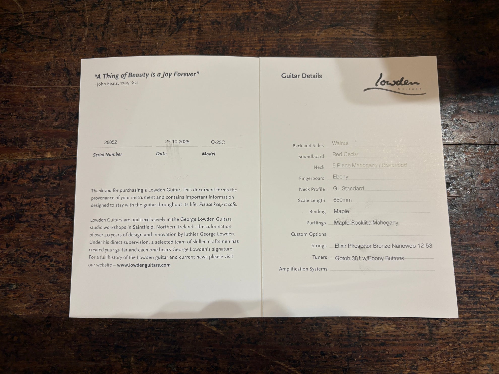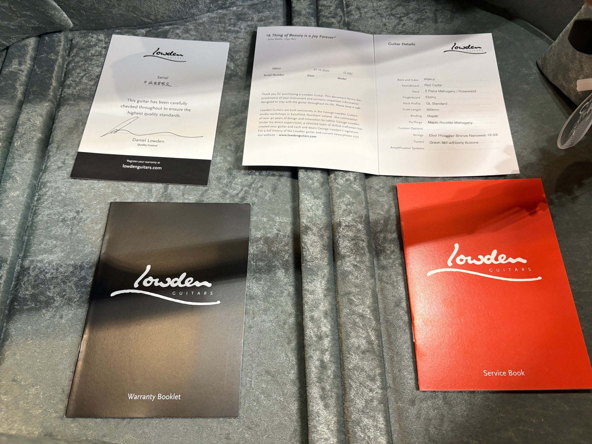 Lowden O-23c Red Cedar/Walnut, brand new. Made in Northern Ireland. Includes OHSC.