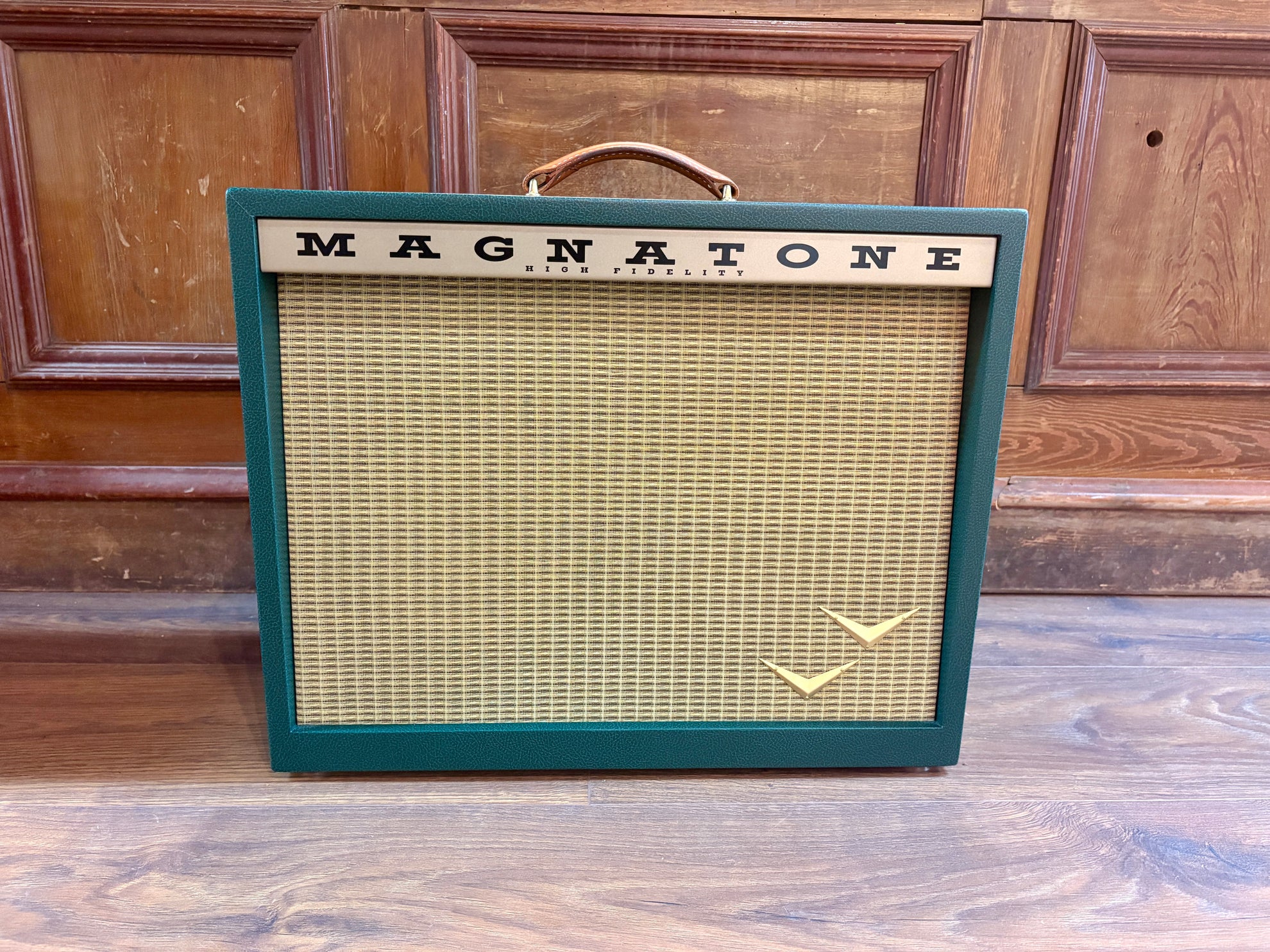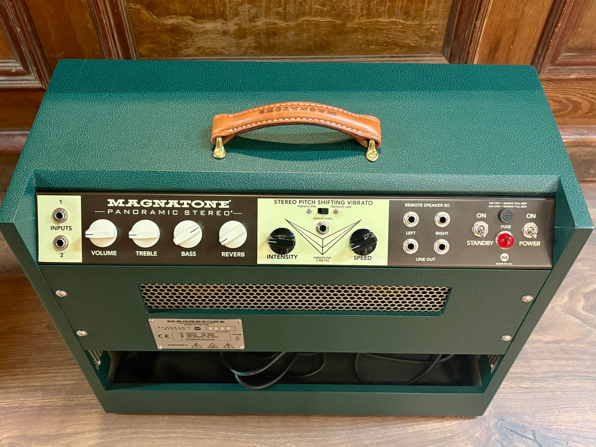 With the Panoramic Stereo 2 x 10-inch all-tube amplifier, Magnatone managed to put a world of vintage-style effects and tone into a conveniently sized combo for gigging, rehearsing, and recording. It sings with the highly detailed clean sounds and gritty power-tube overdrive that have made the brand so desirable. But the addition of onboard effects and two 12-watt power sections offer old-school sonic options, such as stereo pitch shifting, tremolo, and spring reverb. And the Panoramic Stereo combo puts that sound through two Jensen 10-inch speakers.
