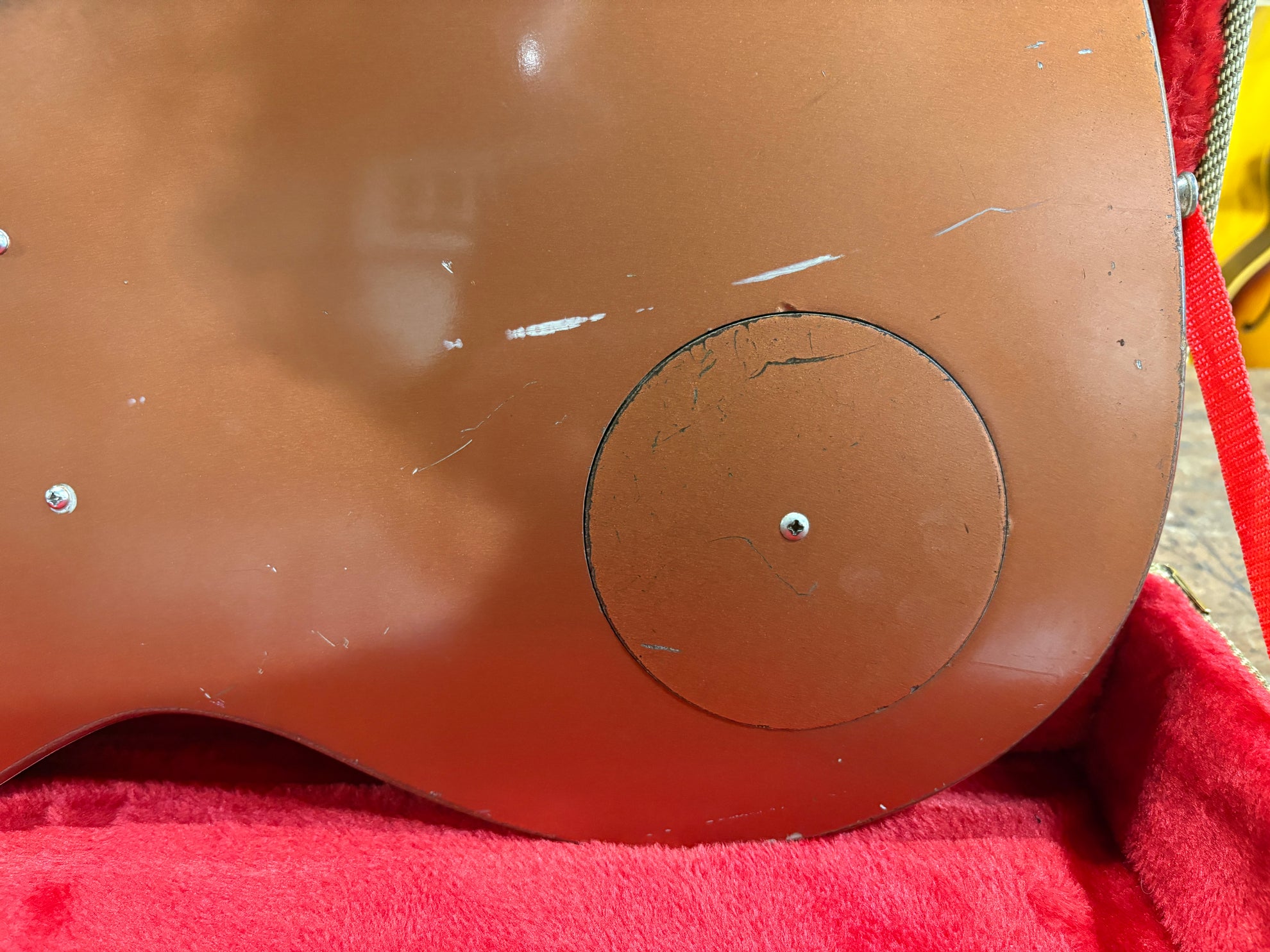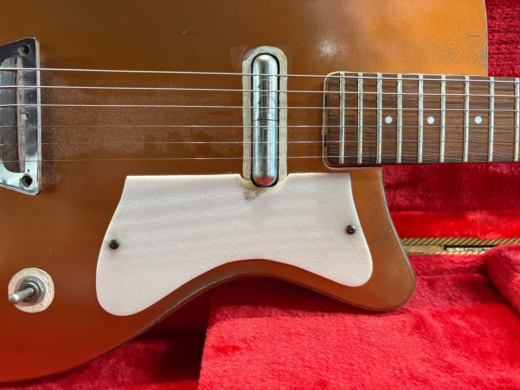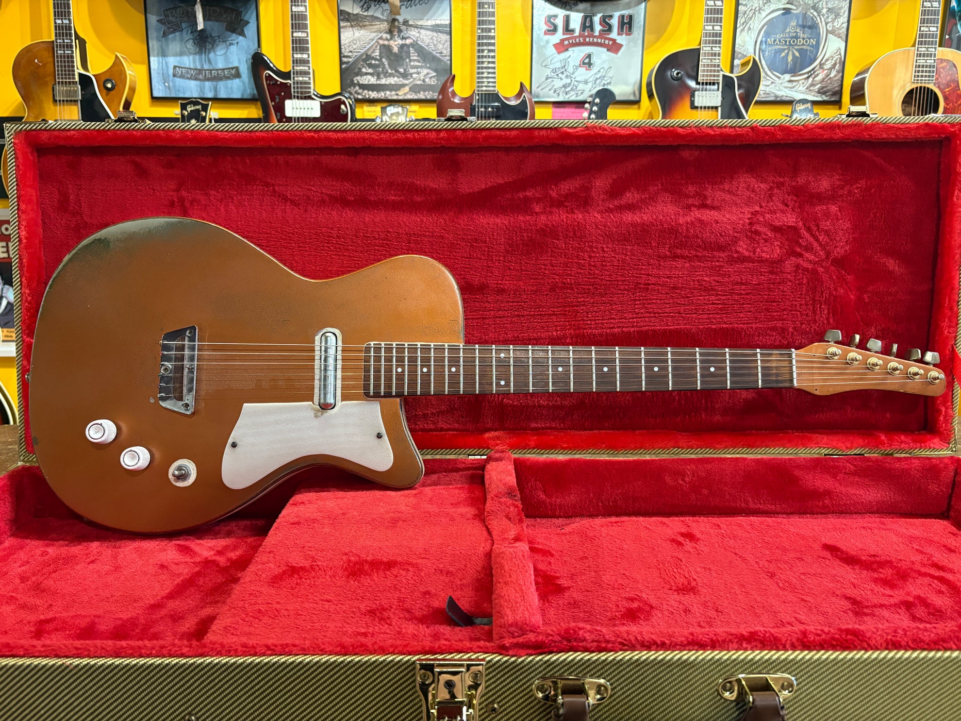 c. 1960 Silvertone U-1 Metallic Copper, in overall very good vintage condition. All original aside from changed tuners and a re-fret. Some lovely greening naturally occurring on the finish, a seriously cool looking and great playing machine. Includes a gig bag.